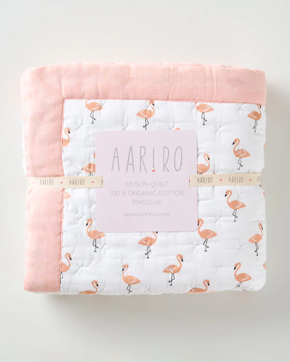 Aariro Baby Quilt -100% Organic Muslin Cotton-Ultra Soft & Breathable-White & Light Pink-Tropical Flamingo-For Infants
