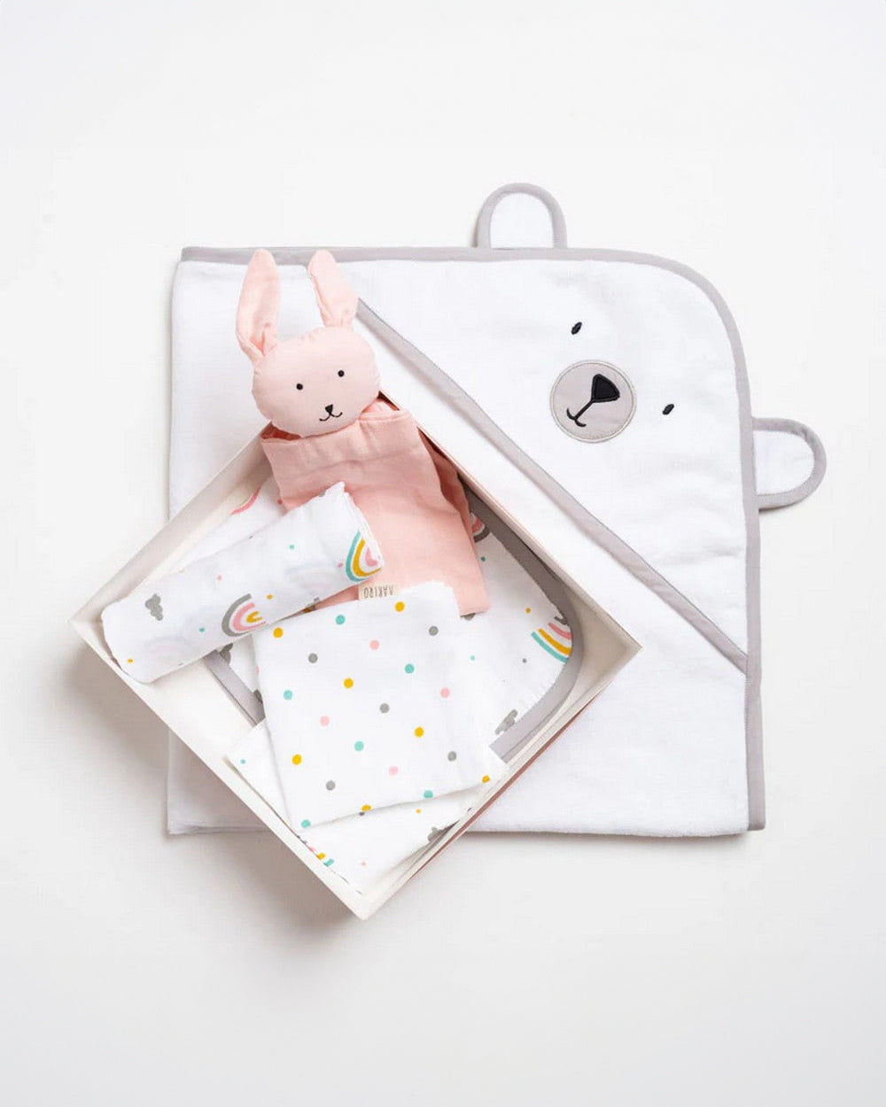 1x Swaddle, 1x Hood Towel, 2x Muslin Washcloth, 1x Burp Cloth & 1x Cuddle Cloth