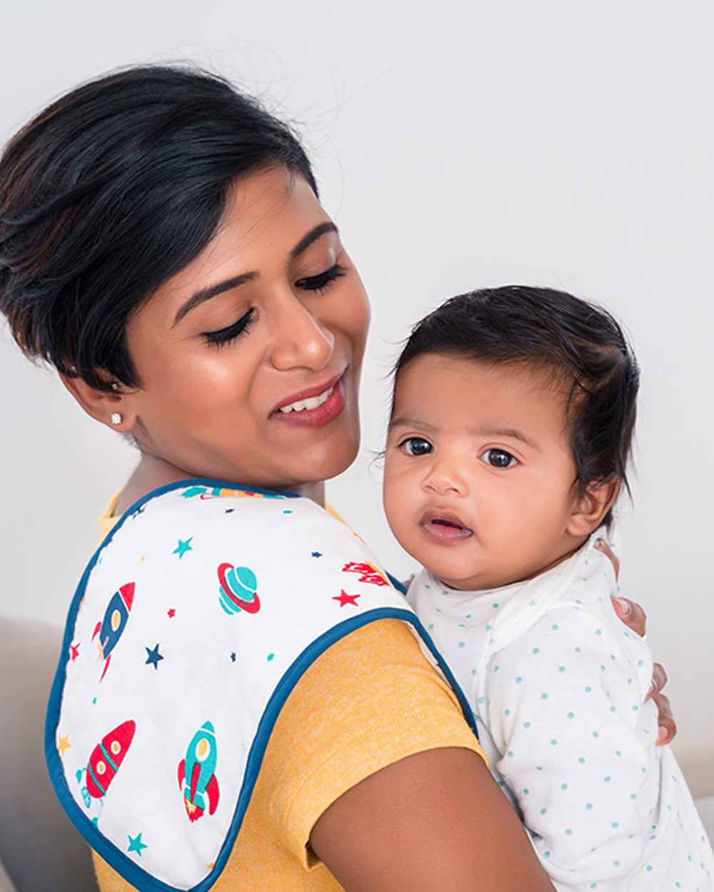 Our reversible organic cotton muslin burp cloths are super absorbent and incredibly handy for everyday use. Designed with four layers of soft muslin, they quickly soak up spit-ups, making burp time clean and comfortable for both you and your baby. The contoured shape ensures a perfect fit on your shoulder.
