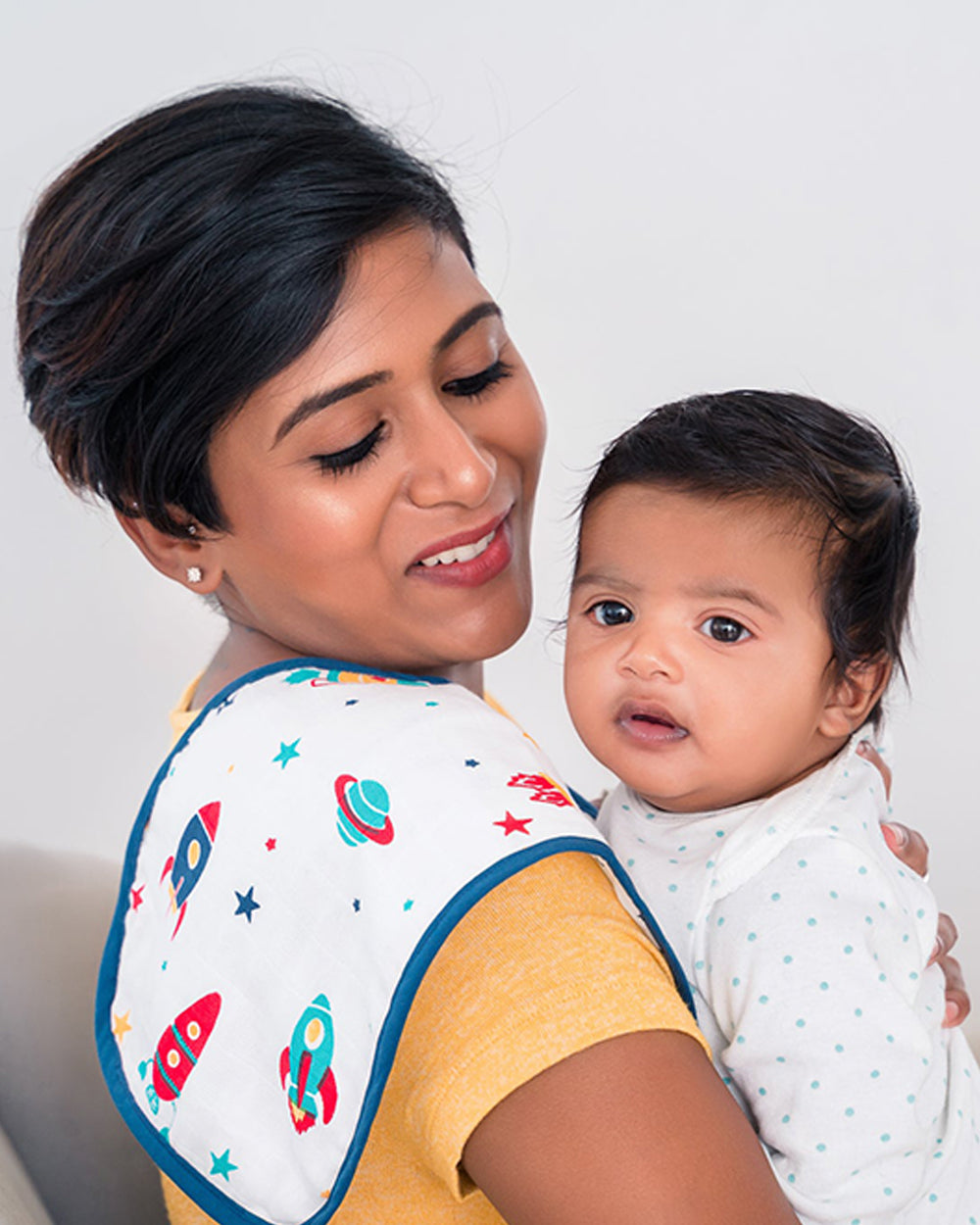 Our reversible organic cotton muslin burp cloths are super absorbent and incredibly handy for everyday use. Designed with four layers of soft muslin, they quickly soak up spit-ups, making burp time clean and comfortable for both you and your baby. The contoured shape ensures a perfect fit on your shoulder.