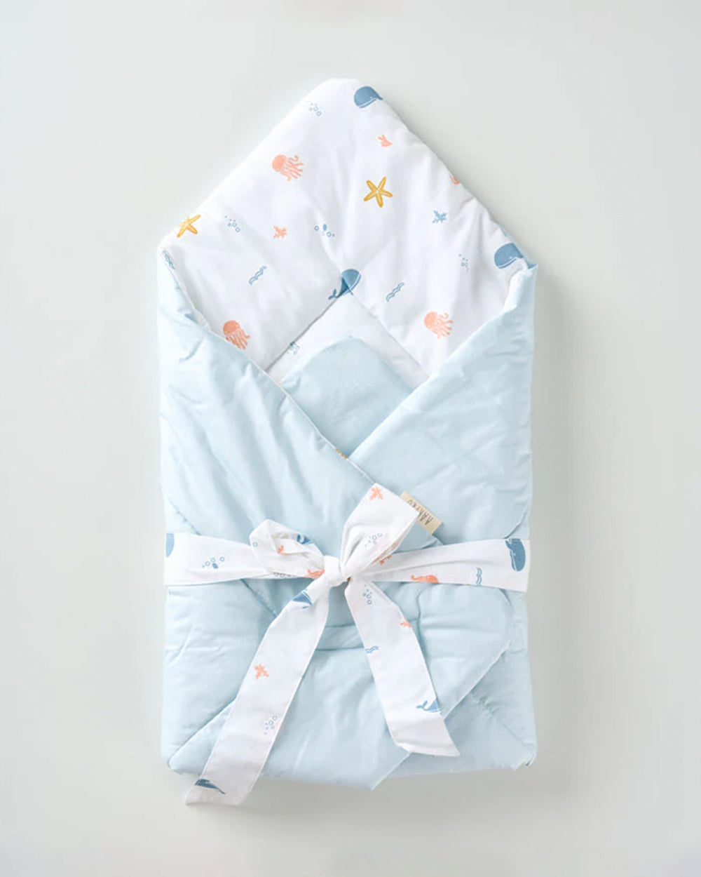 Aariro Quilted Baby Carrier Nest Cum Receiving Blanket-Under the Sea-White & Light Blue-For Infants