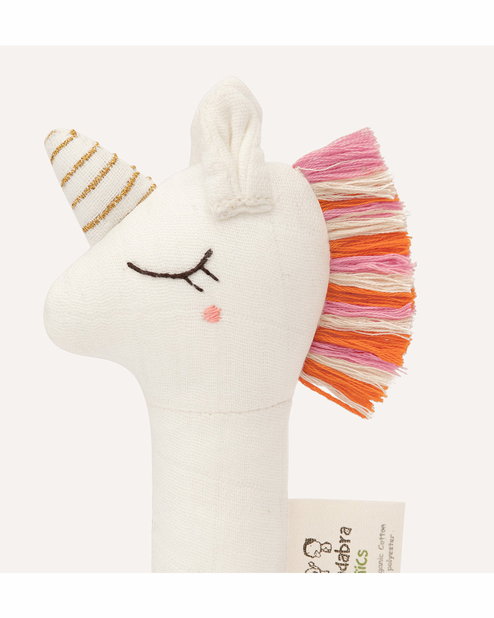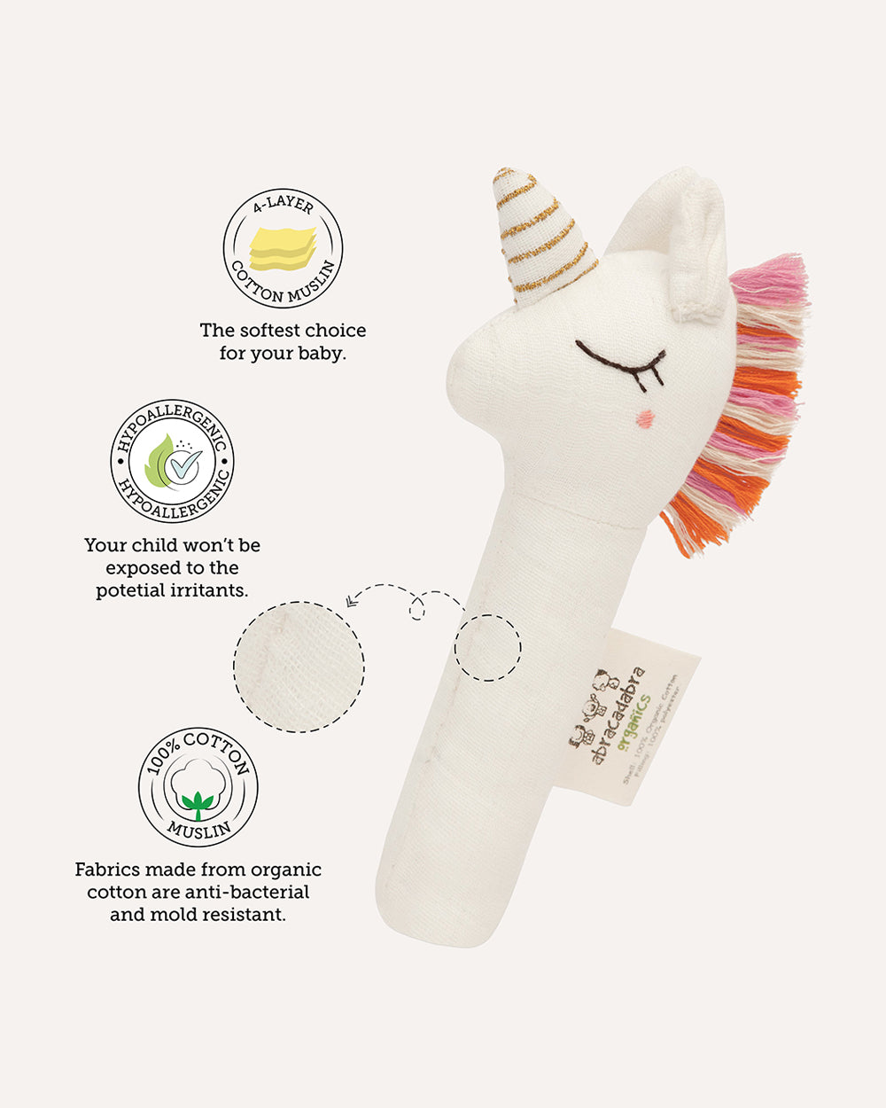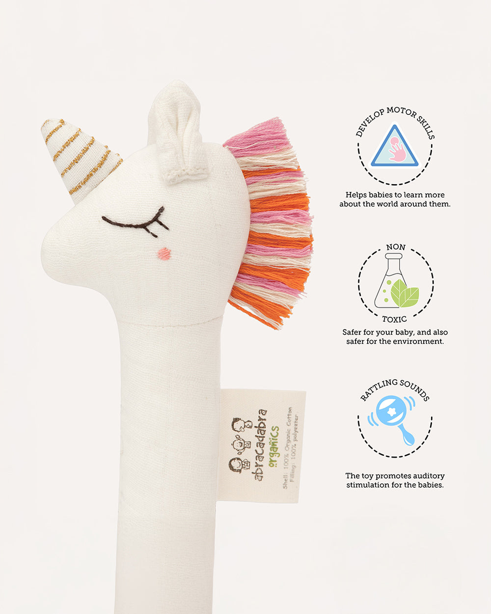 Abracadabra Unicorn Organic Hand Rattle Toy-Soft & Lightweight-Promotes Hand Eye Coordination-White-For Newborn