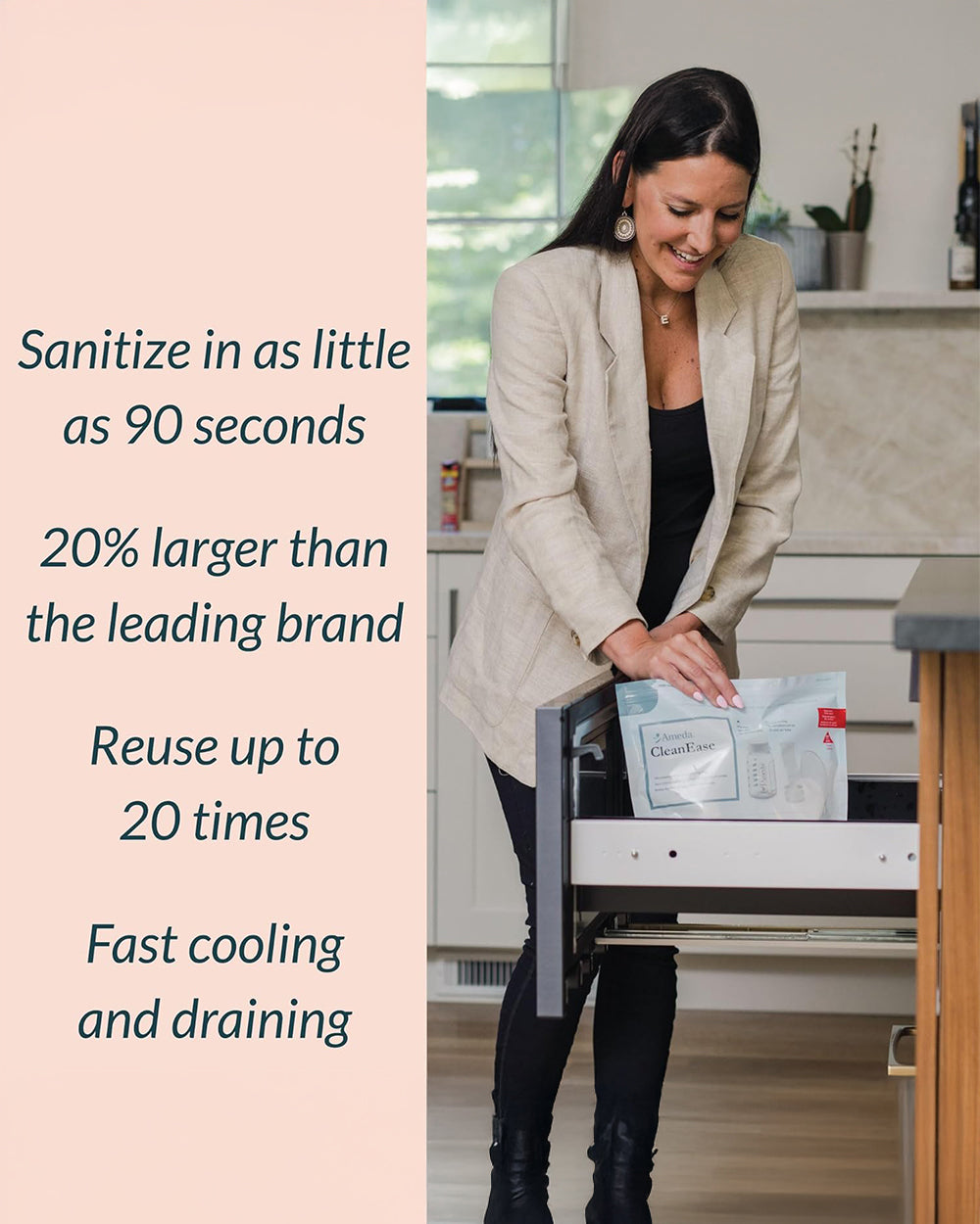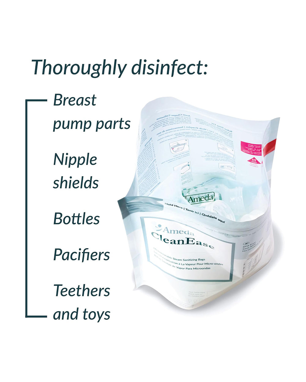 Ameda CleanEase Microwaveable Steam Sanitizing Bags are a fast, efficient, and convenient solution to keep your breast pump parts sanitized and safe. In just under 5 minutes, these steam bags sanitize a variety of breast pump kit parts, including flanges, adapters, diaphragms, valves, nipple shields, breast shells, collection bottles, and lids. Featuring a large steam vent for quick cooling and a Press N' Seal leak-proof zipper, CleanEase bags help you maintain a mess-free and hygienic environment. With durable, high-temperature-resistant materials, these bags are designed to withstand multiple uses.