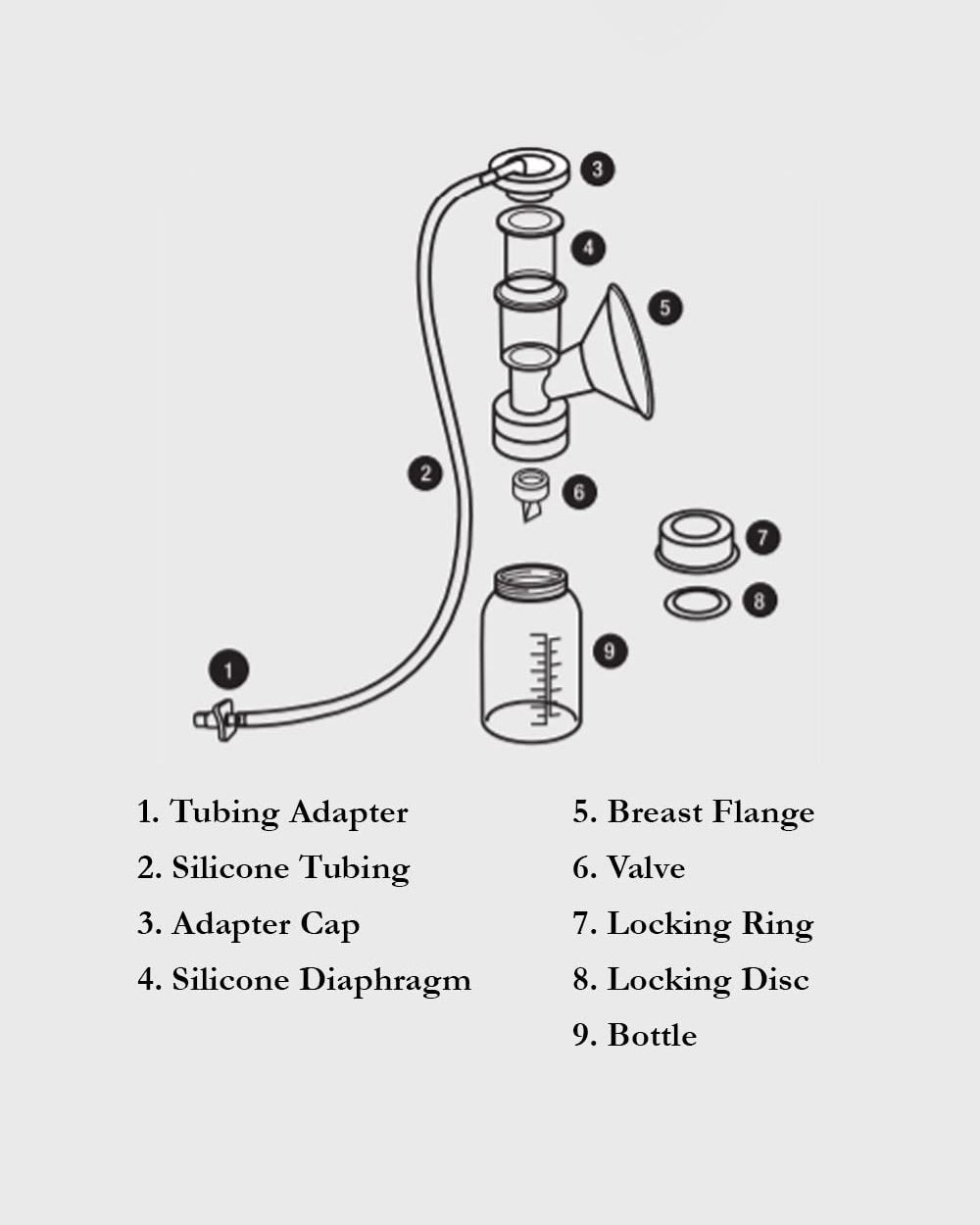 1x Breast Shell, 2x Valves, 1x Diaphram, 1x Bottle(118 ml), 1x Tubing , 1x Bottle Cap, 1x Tubing Connector, 1x Locking Disk & Ring