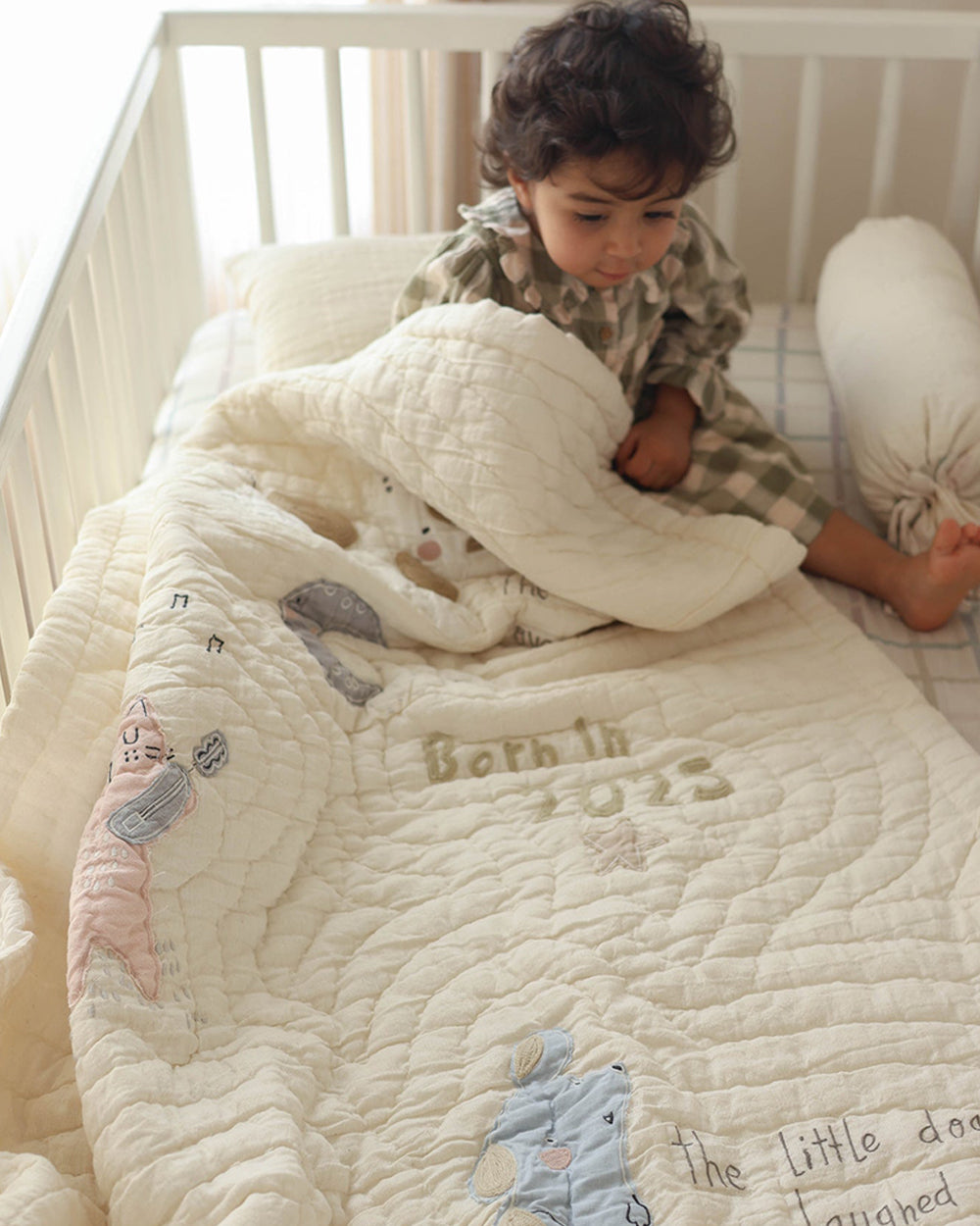 Aplito Baby Bedding Set-Hey Diddle Diddle-Hand Embroidered-Cotton Linen-Beige-For Infants