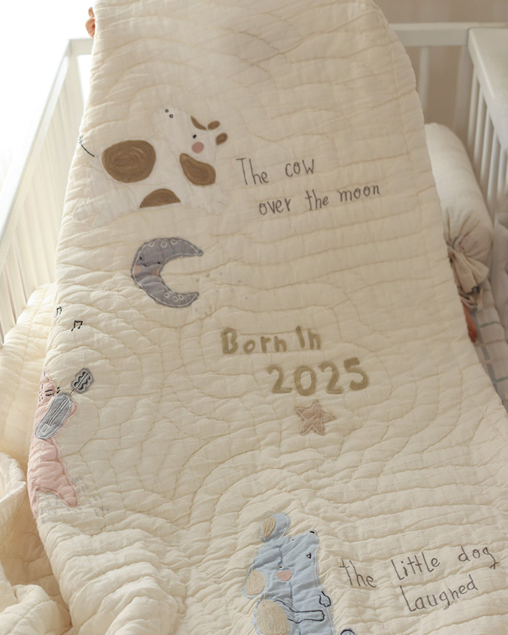 The "Hey Diddle Diddle" Baby Bedding Set is a charming nursery collection inspired by the classic nursery rhyme, featuring whimsical and artistic patchwork. Crafted from a soft cotton linen blend, this handcrafted set showcases beautifully embroidered scenes—including the cat, the moon, the cow, and the fiddle—to create a playful and cozy atmosphere for your little one's nursery.