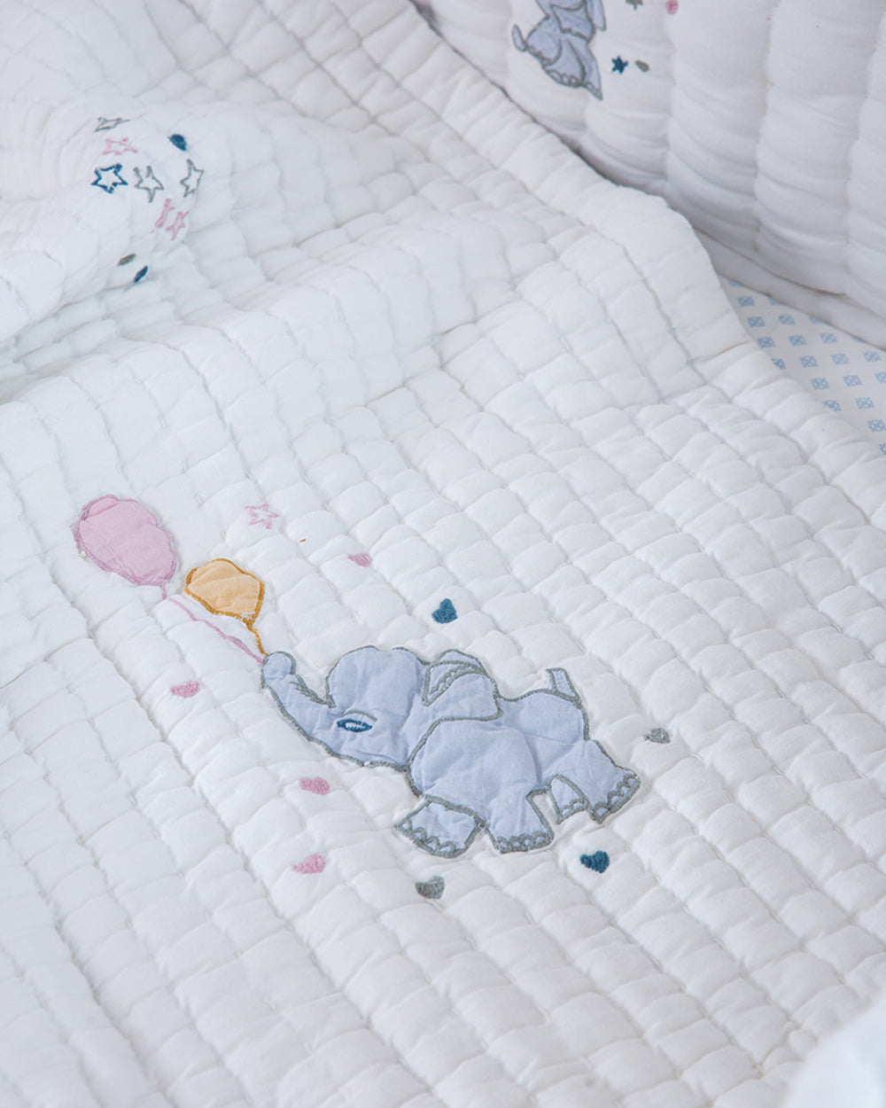 • Handcrafted Elephant Patchwork: Features charming hand-quilted designs of playful elephants in soothing pastel shades.