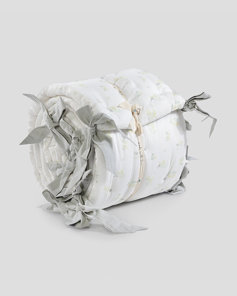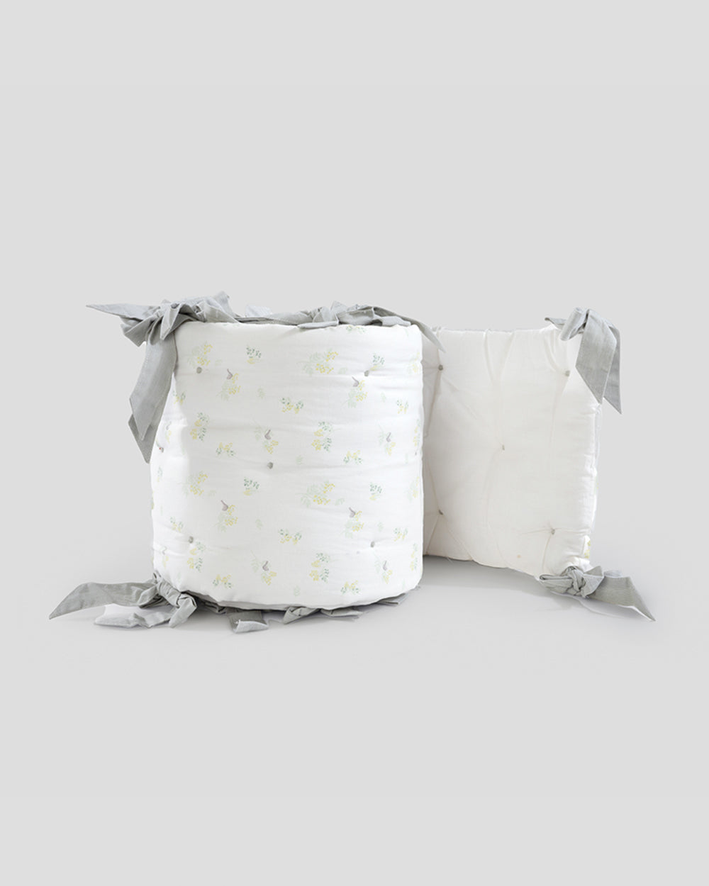 Finish your baby's bedding set with the Bows and Greens Baby Crib Bumper, made from the softest 100% organic poplin cotton. This reversible bumper features a delicate nature print and charming bows, adding both style and comfort to the crib. Quilted with contrast thread, it offers a snug, cozy feel while providing gentle protection. Thoughtfully handcrafted and pre-washed, it’s designed with care for both comfort and peace of mind.