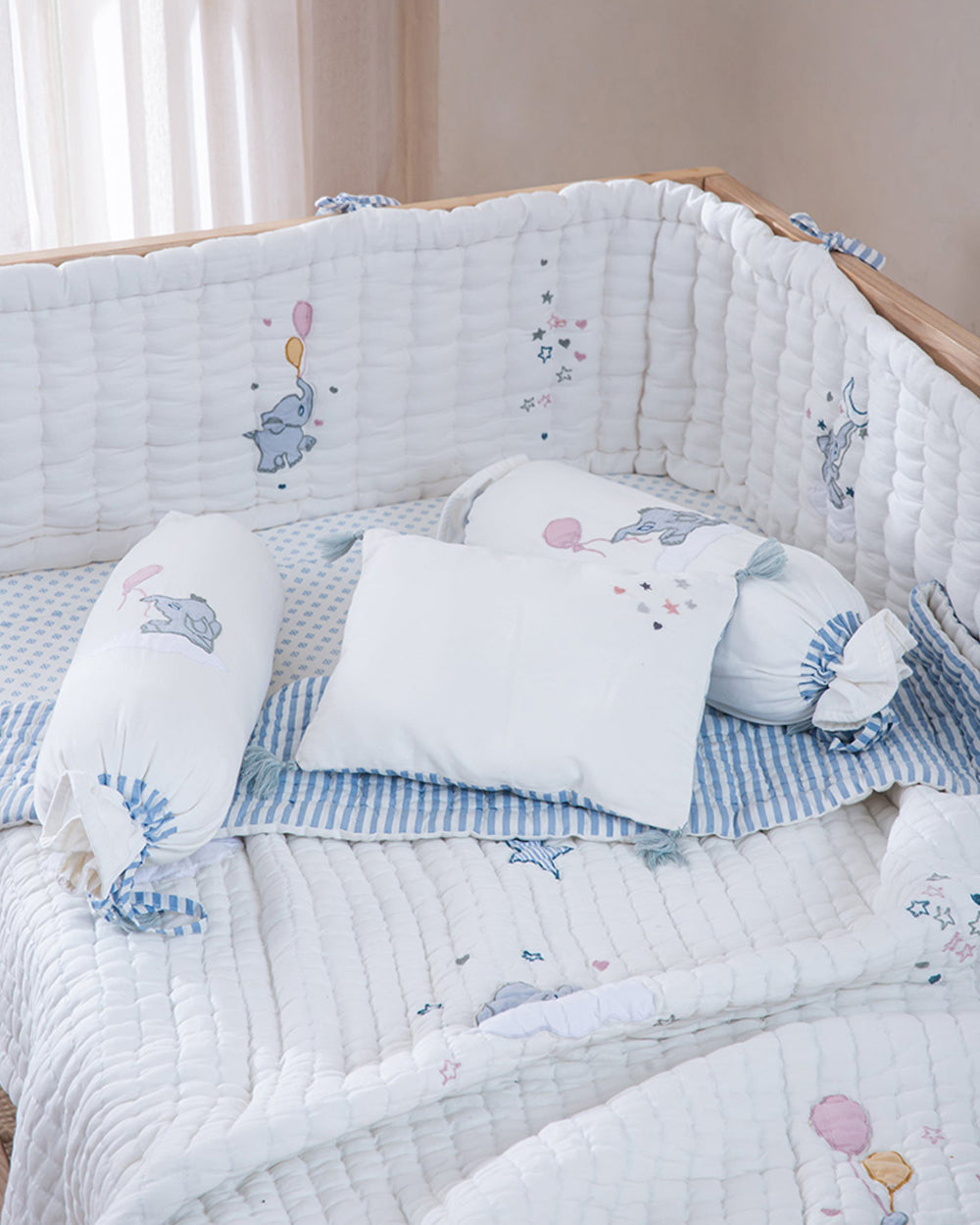 Aplito Baby Cot Bumper-Little Tuskers-100% Organic Poplin Cotton-Light Blue-For Infants