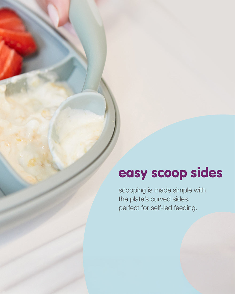 The 2-in-1 suction plate is a mealtime essential that grows with your child. Ideal from the very first feeds to independent eating, its modular design includes a strong suction base and removable divider for maximum flexibility. With three sections for portioning, a mess-reducing edge, and curved sides for easy scooping, it’s built to support every stage of feeding with less mess and more success.