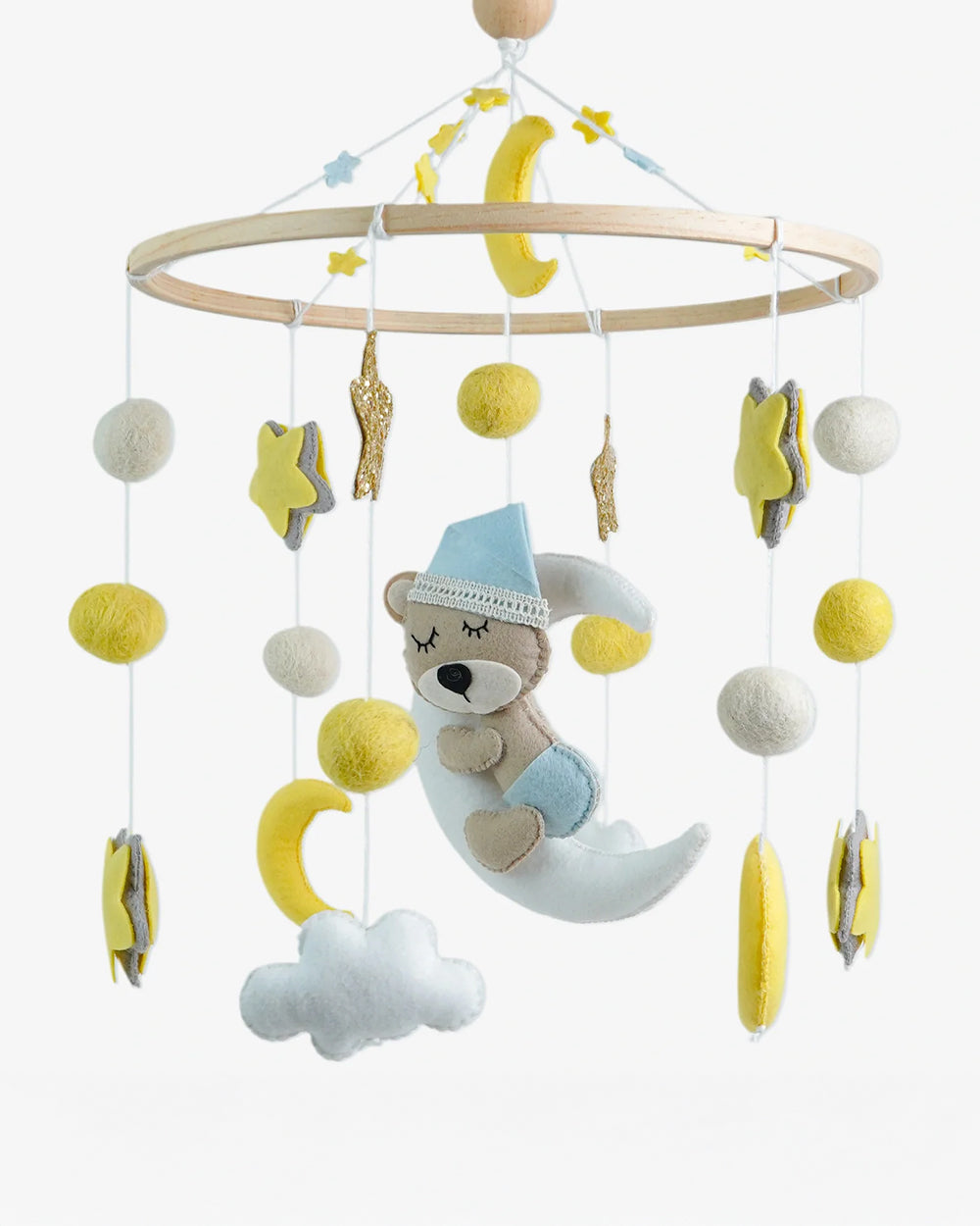 The Babble Wrap Cot / Crib Mobile – Dreaming Teddy Bear is designed to create a calm and dreamy atmosphere in your baby’s nursery. Featuring a soft felt teddy bear gently resting on a crescent moon amidst stars and clouds, this handcrafted mobile captures your baby’s attention with gentle motion and soothing textures. Perfect for hanging above a crib or changing area, it stimulates visual development while adding a touch of elegance and whimsy to the room. Thoughtfully made with high-quality materials, it brings both beauty and comfort to your baby’s sleep space.