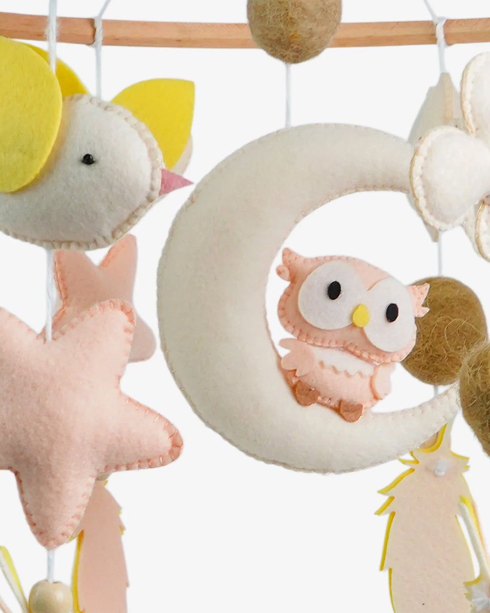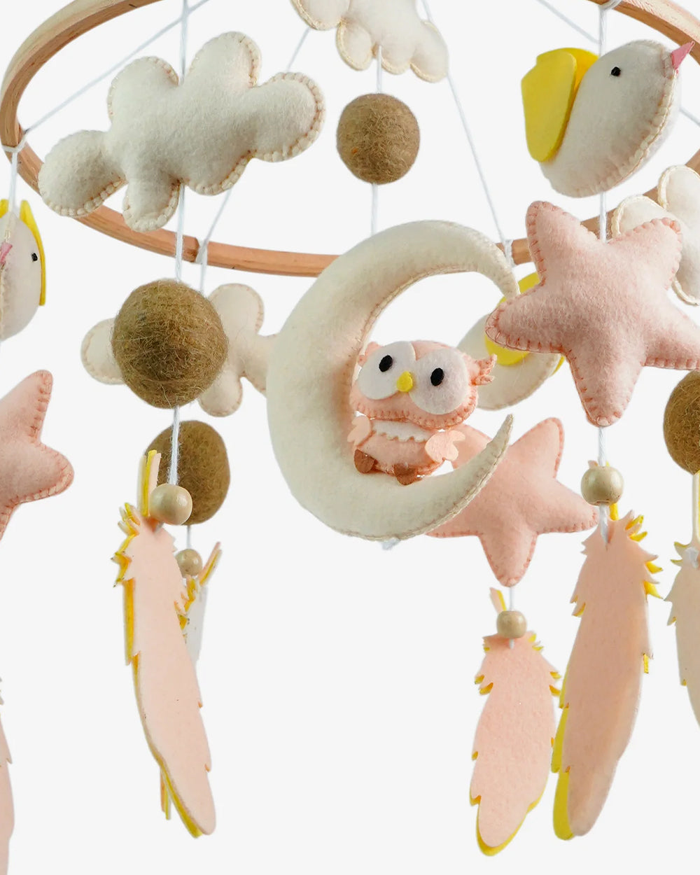 • Enchanting Owl & Moon Design: Features felt owls, stars, clouds, and feathers that gently rotate to create a calming, nature-inspired nursery look.