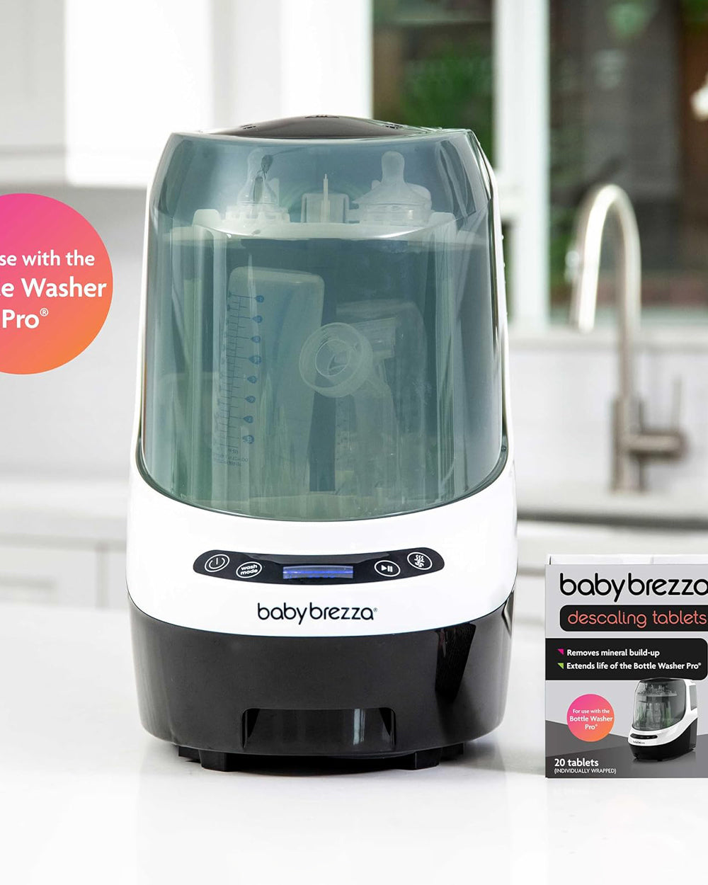The Baby Brezza Bottle Washer Descaling Tablets are specially designed for use with the Baby Brezza Bottle Washer Pro®. These tablets offer a safe, effective, and baby-friendly way to remove mineral build-up from your machine, ensuring optimal performance and hygiene. Made with non-toxic, hypoallergenic ingredients, they help maintain your appliance and keep baby bottles and accessories clean and safe for use.