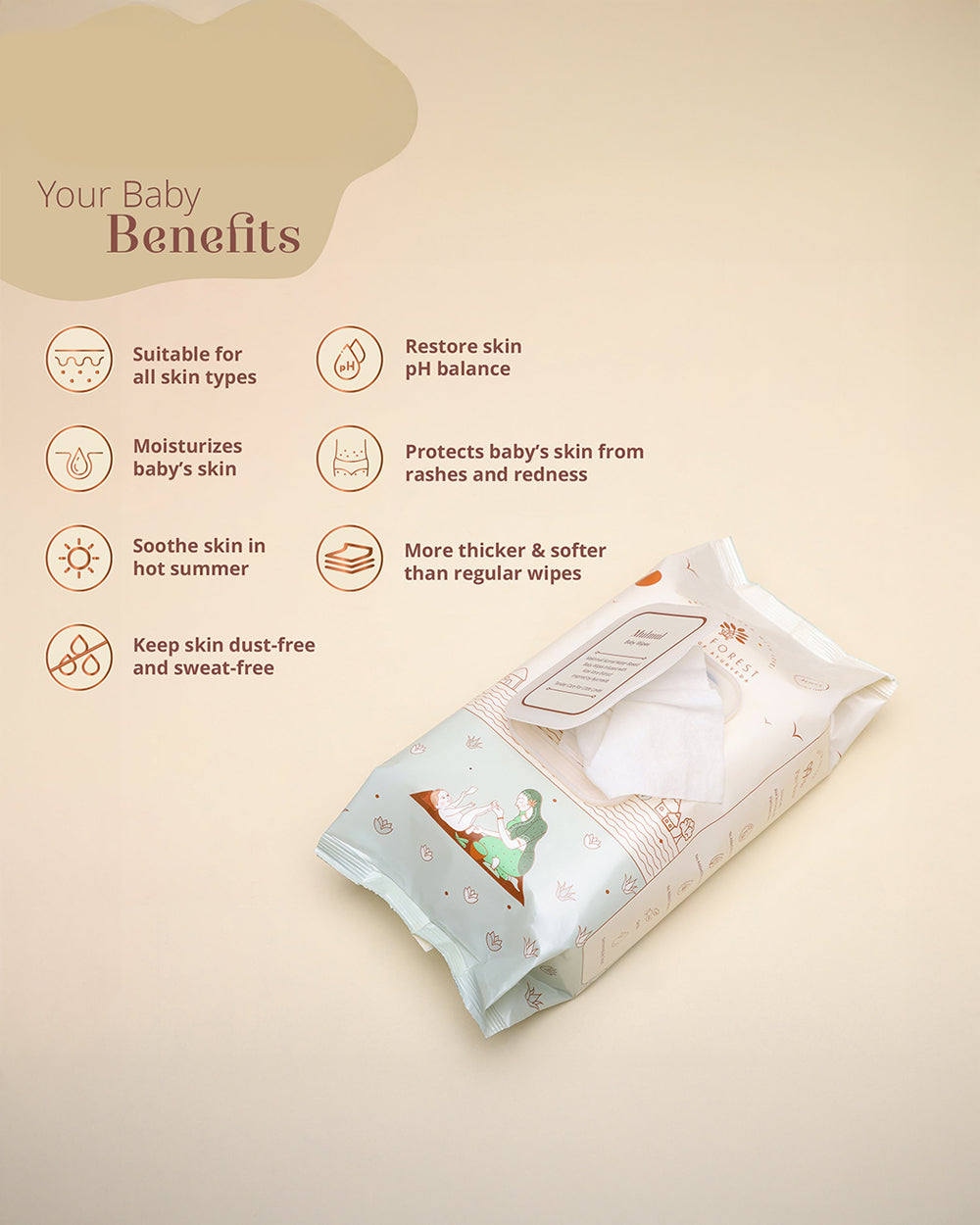 Baby Forest Mulmul Baby Wipes are ultra-soft, water-based wipes designed to gently cleanse and nourish your baby's sensitive skin. Infused with aloe vera extract and crafted from plant-based fabric, these wipes offer a soothing touch, making them ideal for daily use.