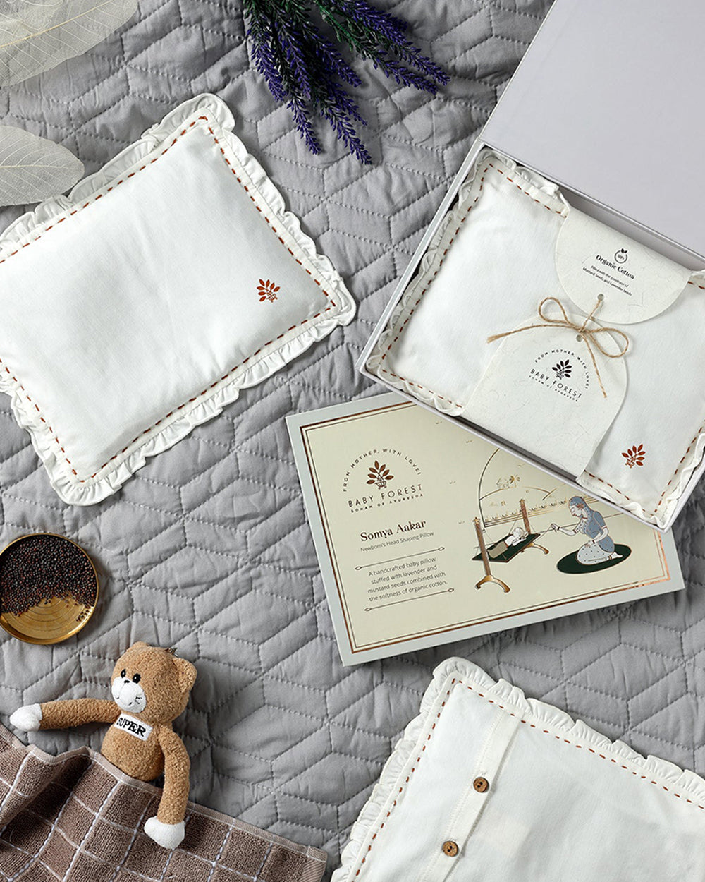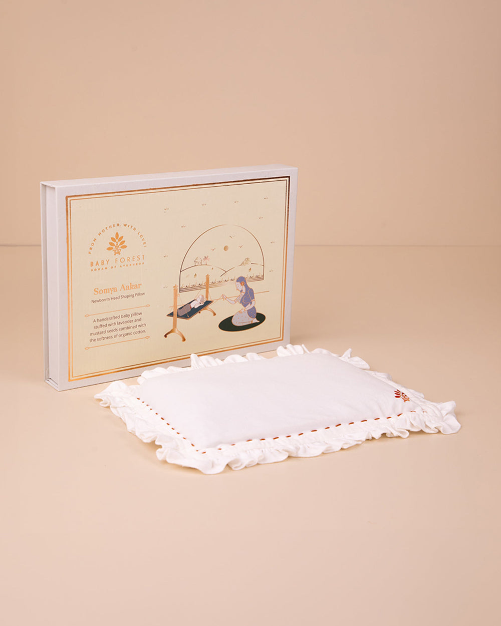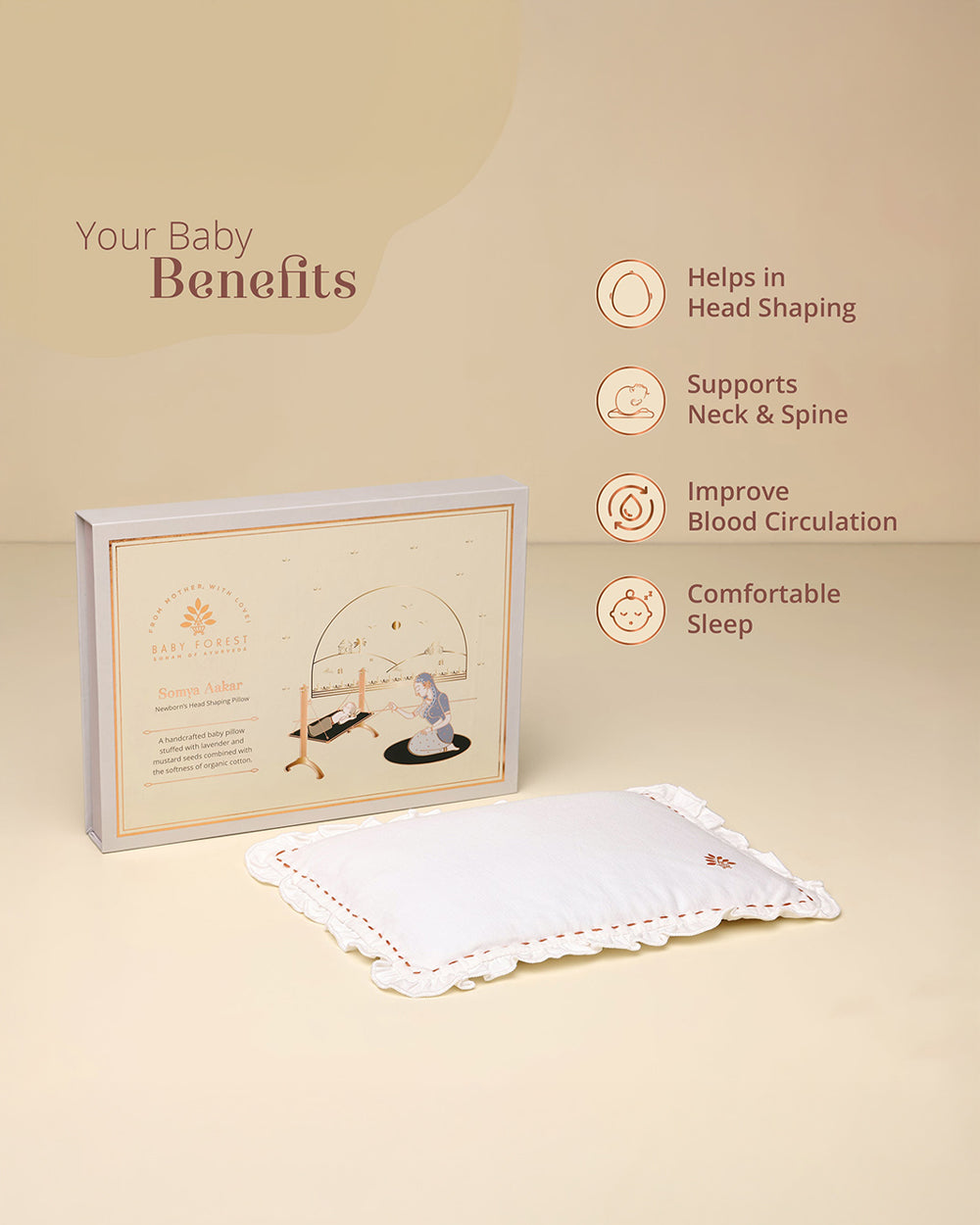 The Somya Aakar Newborn’s Head‑Shaping Pillow is thoughtfully designed to support a baby’s delicate head, neck, and spine. Made with organic cotton and filled with mustard (rai) and lavender seeds, it provides natural comfort, helps prevent flat head syndrome, and ensures restful sleep for infants aged 0 to 6 months.