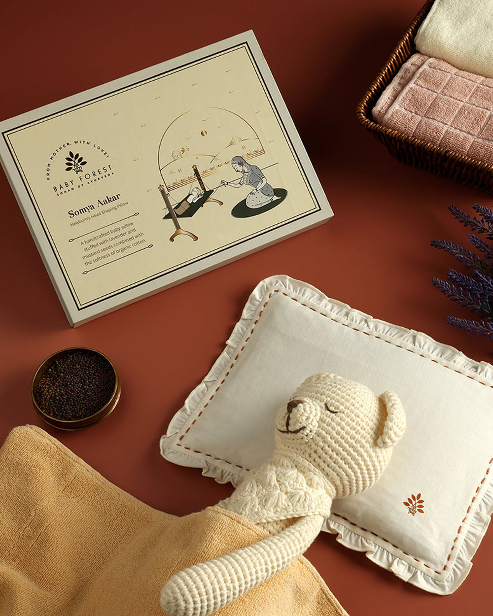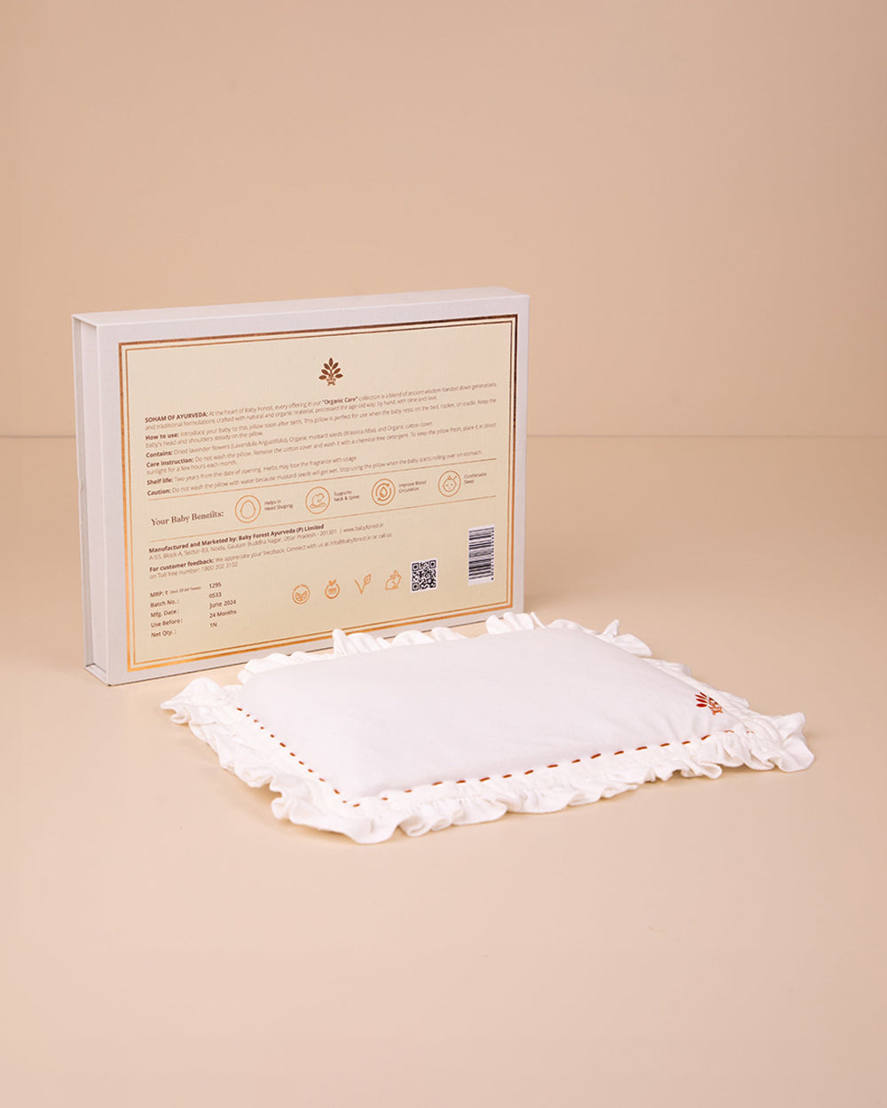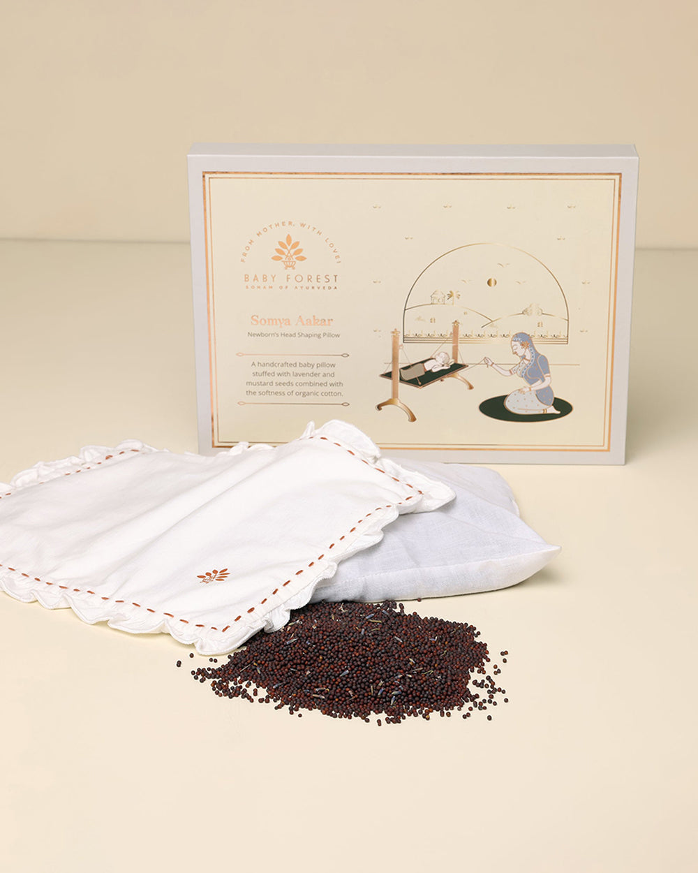 The Somya Aakar Newborn’s Head‑Shaping Pillow is thoughtfully designed to support a baby’s delicate head, neck, and spine. Made with organic cotton and filled with mustard (rai) and lavender seeds, it provides natural comfort, helps prevent flat head syndrome, and ensures restful sleep for infants aged 0 to 6 months.
