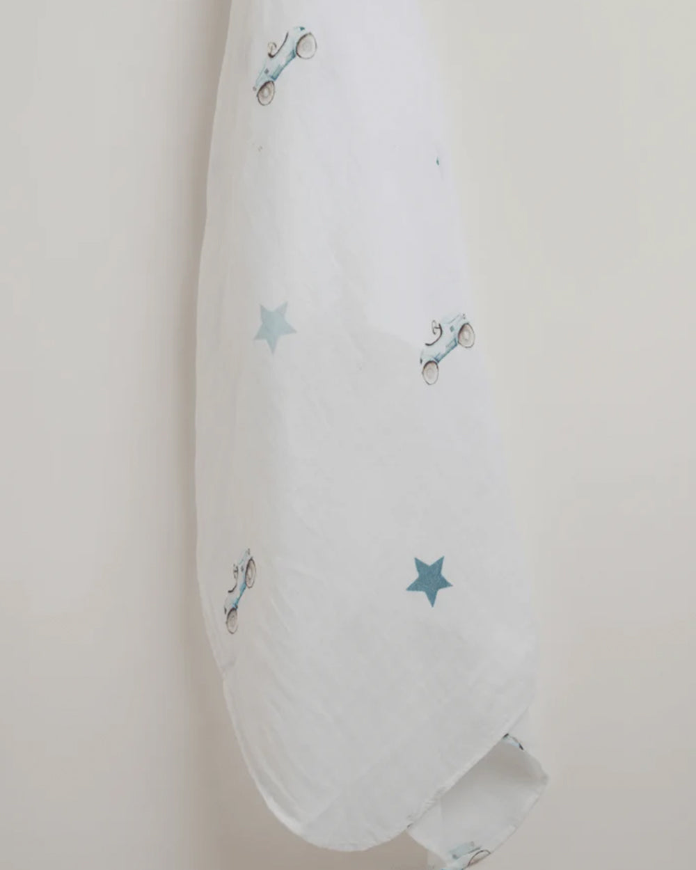 The Roadster Organic Muslin Swaddle Set is a duo of "deliciously soft," breathable organic muslin swaddles from Baby Jalebi, perfectly designed for use from day one. These extra-large, extra-soft swaddles feature the charming Roadster print, which complements the rest of the Roadster Car Collection. Made from 100% Organic Cotton, these versatile cloths are gentle on sensitive skin and are noted for becoming even softer with every wash.
