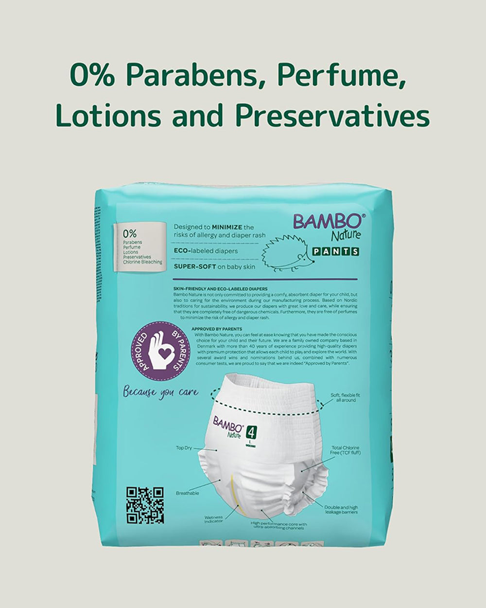 Bambo Nature Pants are soft, flexible, and designed to keep even the most sensitive skin dry and comfortable. With an easy pull-up and pull-down design, they are perfect for active toddlers and ideal for supporting potty training. Featuring a super-absorbent core with advanced channel technology, the pants quickly draw moisture away from the skin and can handle multiple wettings. Dermatologically tested and certified by the Nordic Swan Ecolabel, Asthma Allergy Nordic, and FSC™, these perfume-free, skin-friendly pants offer safe, breathable, and worry-free protection for everyday adventures.