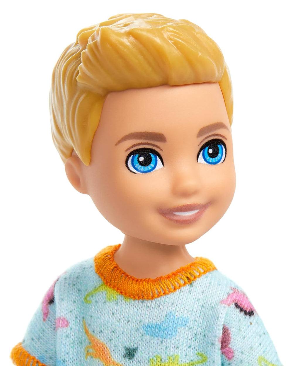 Chelsea Doll, Small Boy Doll Wearing Removable One-Piece with Dinosaur Print & White Shoes, Blond Hair & Blue Eyes. The adorable Chelsea small dolls wear bright colors and come with removable fashion pieces for dress-up fun. Added diversity and more variety in looks and hairstyles provide infinitely more ways to spark imaginations. Kids can collect them all to expand the play possibilities.