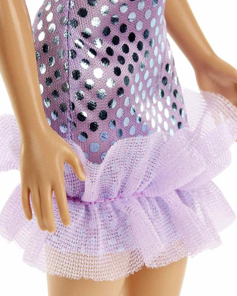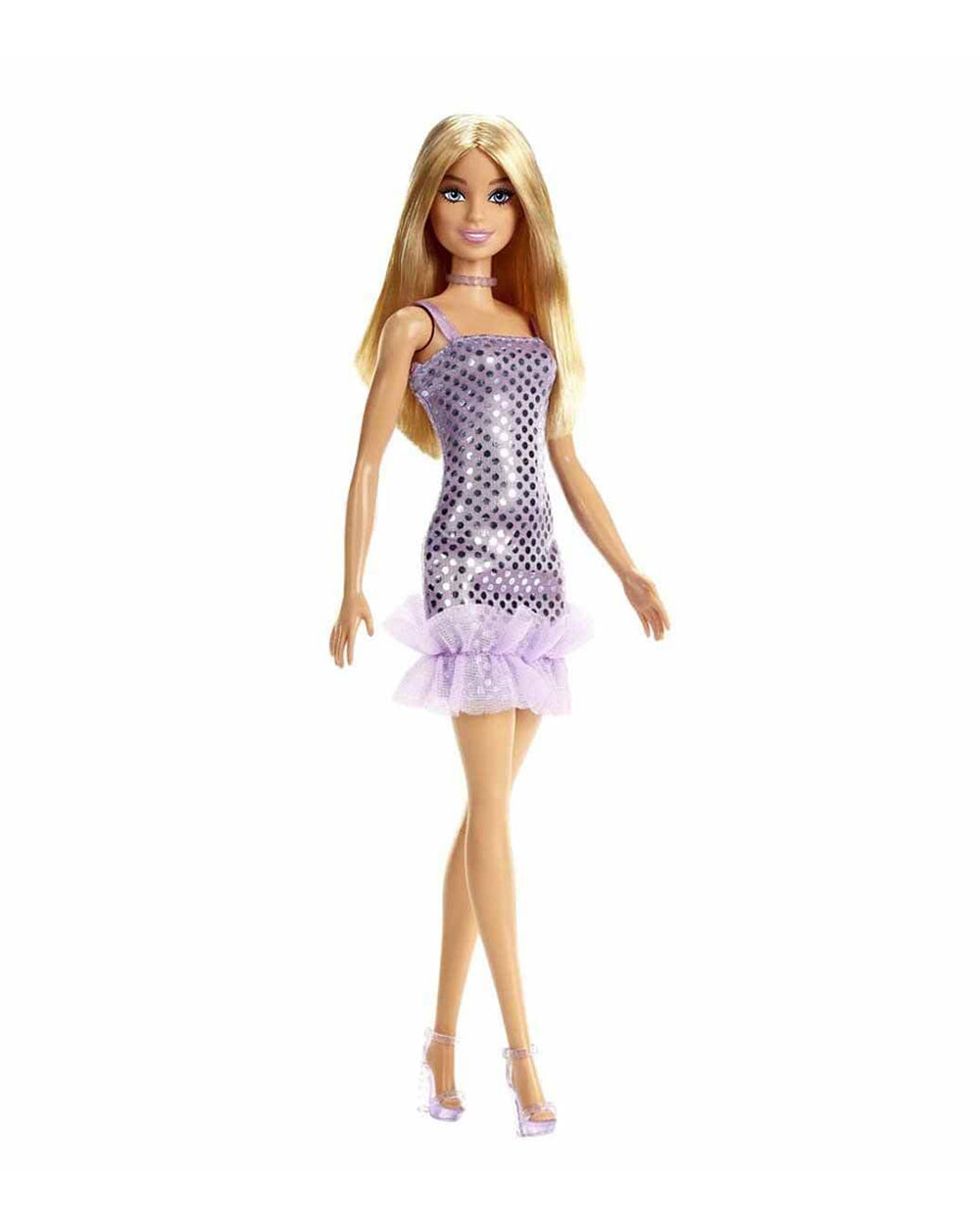 This Barbie doll is the epitome of glamour and style. Dressed in a stunning, all-over metallic lavender dress, she's ready to steal the spotlight at any event. The fitted silhouette and sheer ruffle hem add a touch of sophistication, while the matching choker necklace and sleek heels complete the look with her blonde hair styled straight, Barbie is the ultimate fashion icon.Let your child's imagination shine as they create glamorous stories with this dazzling Barbie doll.