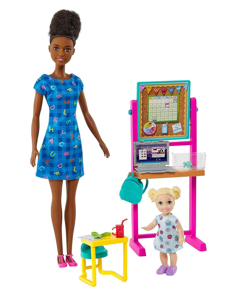 Explore a world of learning fun with the Barbie® Teacher playset that lets kids explore their career aspirations. Barbie® doll (brunette/11.5 in) wears an alphabet letter print dress with pink strappy shoes plus an adorable bun hairdo and is ready to teach! The playset comes with a flipping board that offers two lessons, a backpack, a toddler doll (blonde), toddler desk, scissors, student sheet and a drink to bring the storytelling to life. There's even a classroom pet turtle! And, with her laptop, Barbie® doll is prepared to help students virtually, too. Kids will love trying on the teaching career hat and exploring their dream aspirations. Dolls cannot stand alone. Colors and decorations may vary. For ages 3 and up.