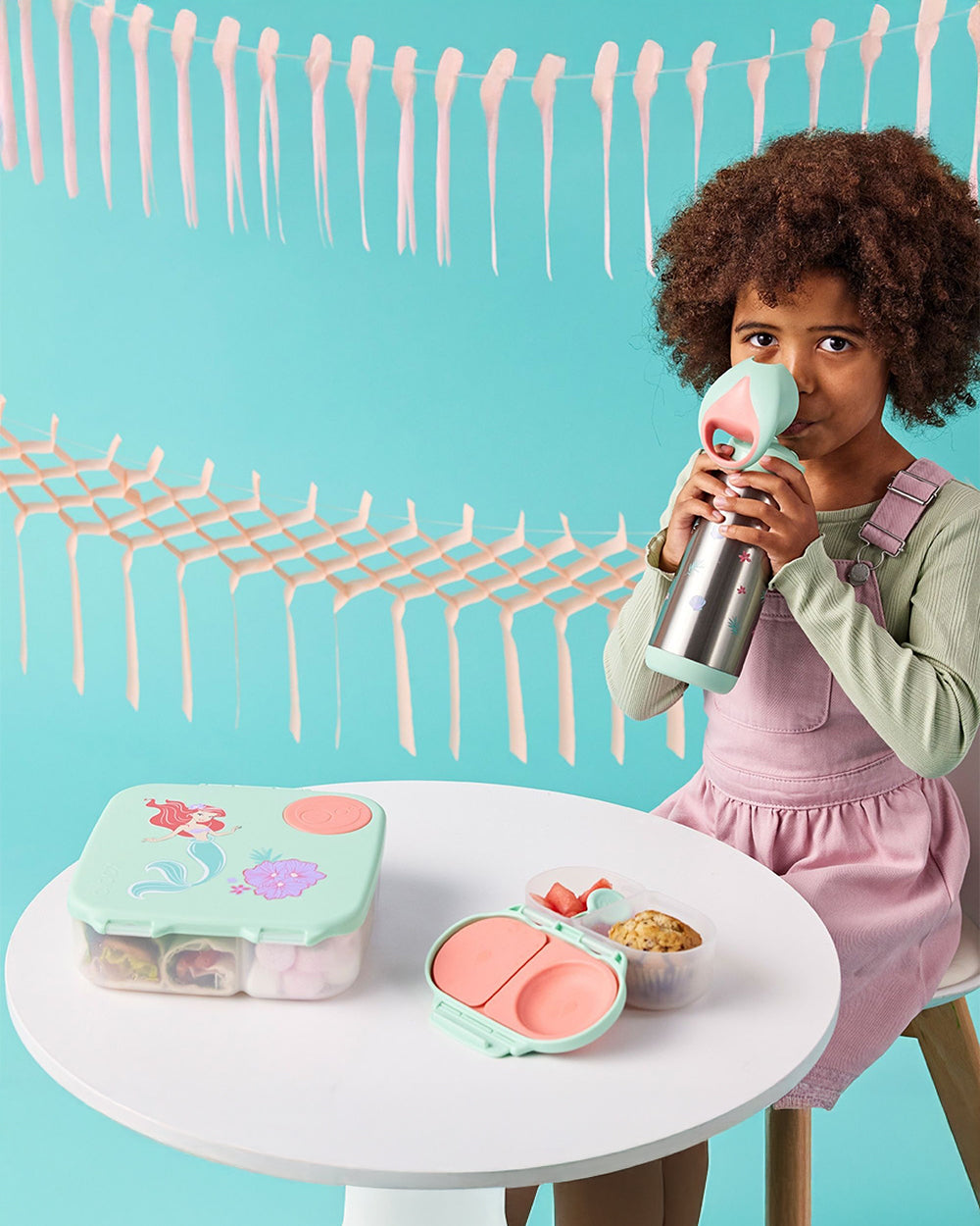 Make snack time magical with the Disney Little Mermaid Leakproof Snackbox by b.box. Perfectly sized for little hands and adventures, this compact box features two leakproof compartments ideal for wet or dry snacks, and a flexible fruit holder to keep small whole fruits secure and fresh. Designed with easy-to-use clips and removable seals for effortless cleaning, it’s made from kid-safe PP and silicone, and decorated with enchanting Ariel-themed artwork little fans will love.