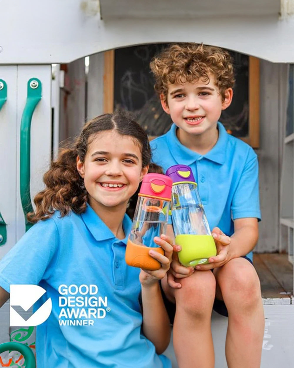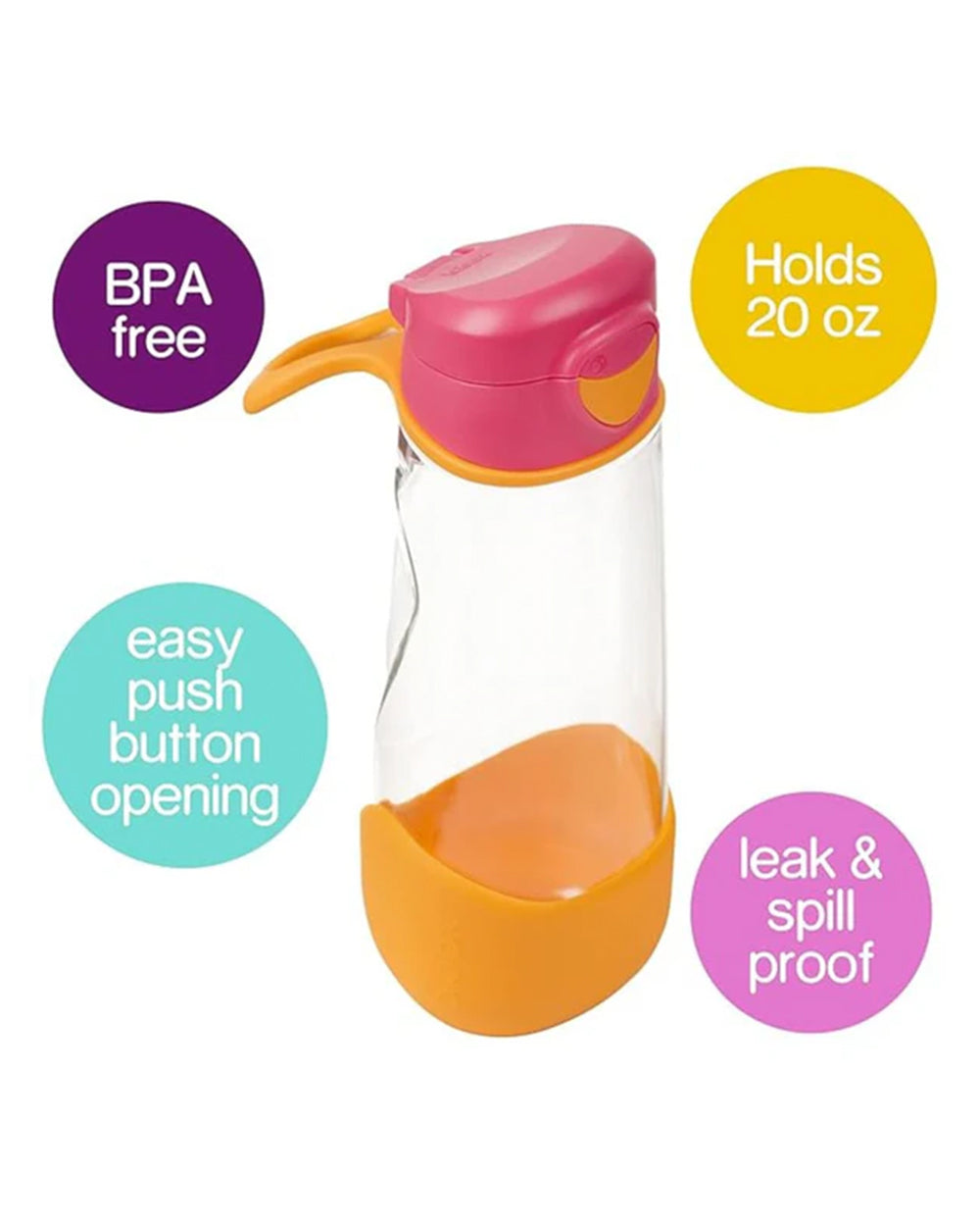 Ideal for active kids on the move, the sports spout bottle delivers effortless hydration with its easy-flow silicone spout and ergonomic triangular design. The push-button flip-top lid makes it simple to open, while keeping the spout clean and leak-proof when closed. Made from lightweight Tritan™, it’s built for durability and features a removable bumper for extra protection. A flexible carry handle and minimal parts make it both kid-friendly and parent-approved.