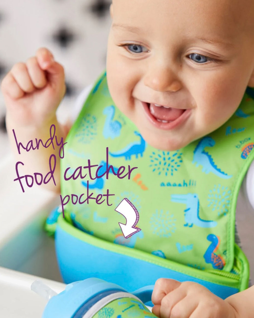 The new travel bib still gives parents the things they love: being able to feed on the go without having to carry around zip lock bags for messy bibs and look uber cool whilst doing it with four new trendy designs. When finished eating, pop the included spoon inside the food catcher and zip closed, no mess in nappy bags from soiled bibs to think about and when parents get home they can simply toss the bib in the washer, making mealtime mess even easier to clean up. BPA, Phthalates and PVC free.