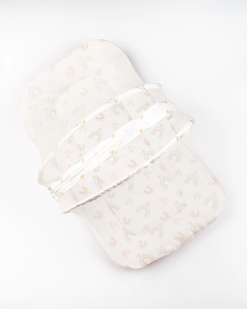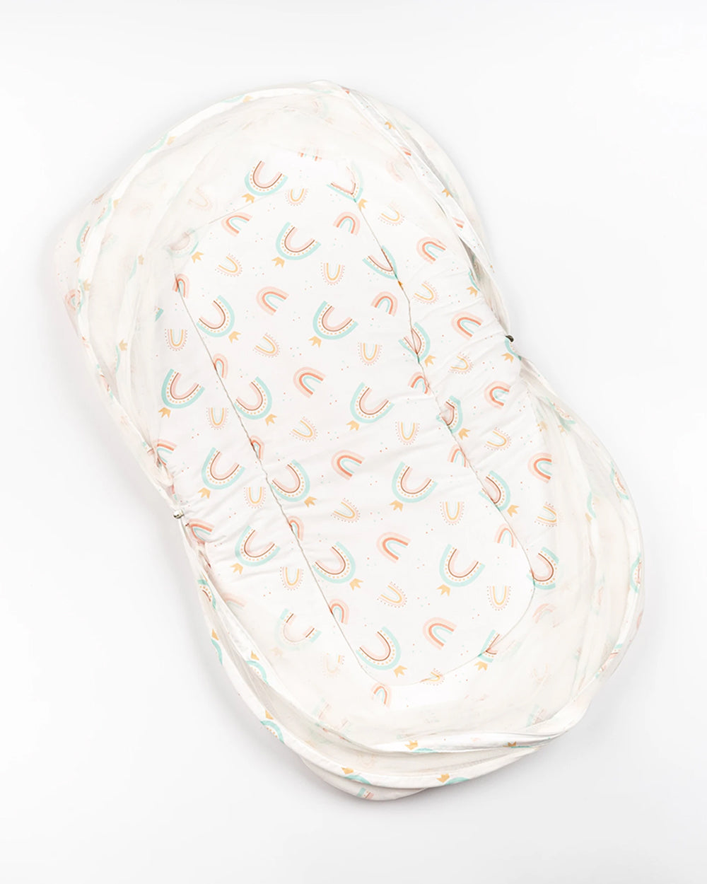 Give your newborn the gift of cozy, protected sleep with the BeeLittle New Rainbow Organic Cotton Bed With Mosquito Net. Made from breathable organic cotton and filled with anti-allergenic polyfiber, this mattress ensures comfort and safety in every nap. Featuring a colorful rainbow print and a spacious, double-zippered mesh net supported by arched frames, it's the perfect companion for peaceful rest at home or on the go.
