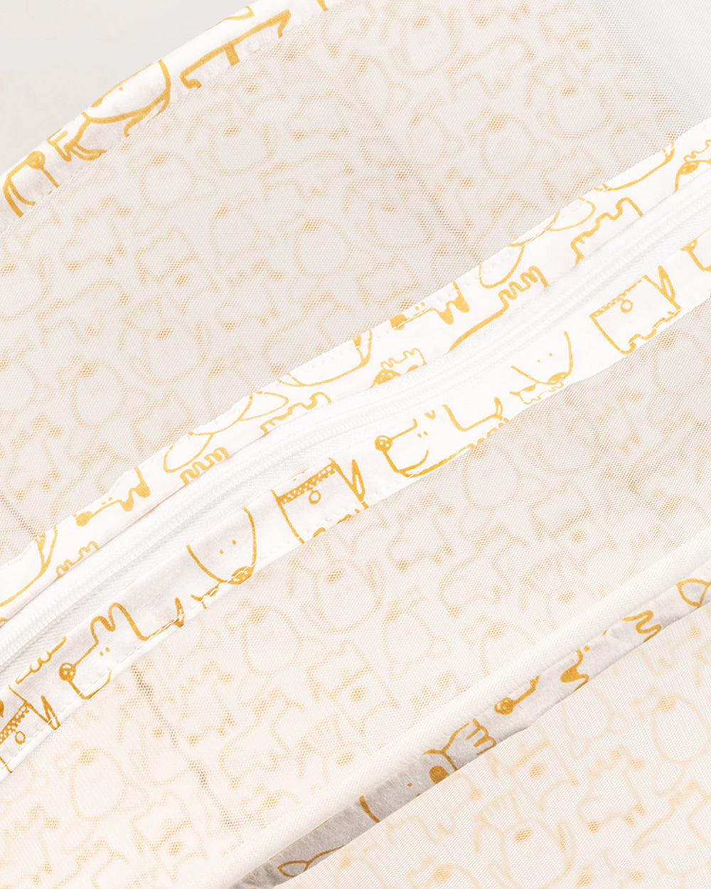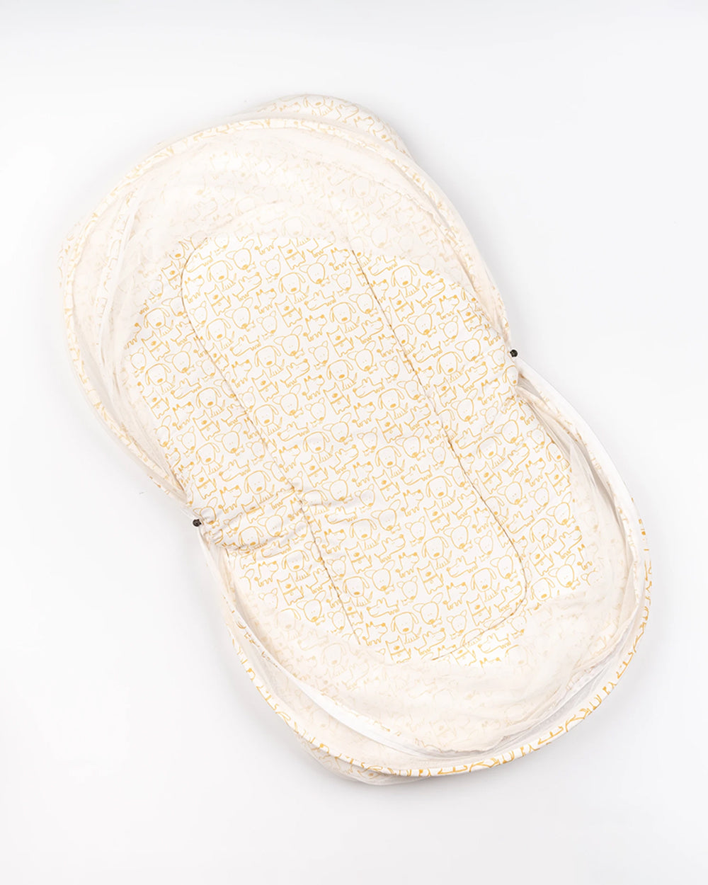 Ensure peaceful naps and safe sleep for your little one with the BeeLittle Mustard Puppy Organic Cotton Bed With Mosquito Net. Crafted from soft cotton fabric and anti-allergenic polyfiber filling, this newborn mattress features a breathable mesh net supported by two sturdy arched frames and a smooth double zipper. The adorable mustard puppy print adds a playful touch, making it both functional and delightful.