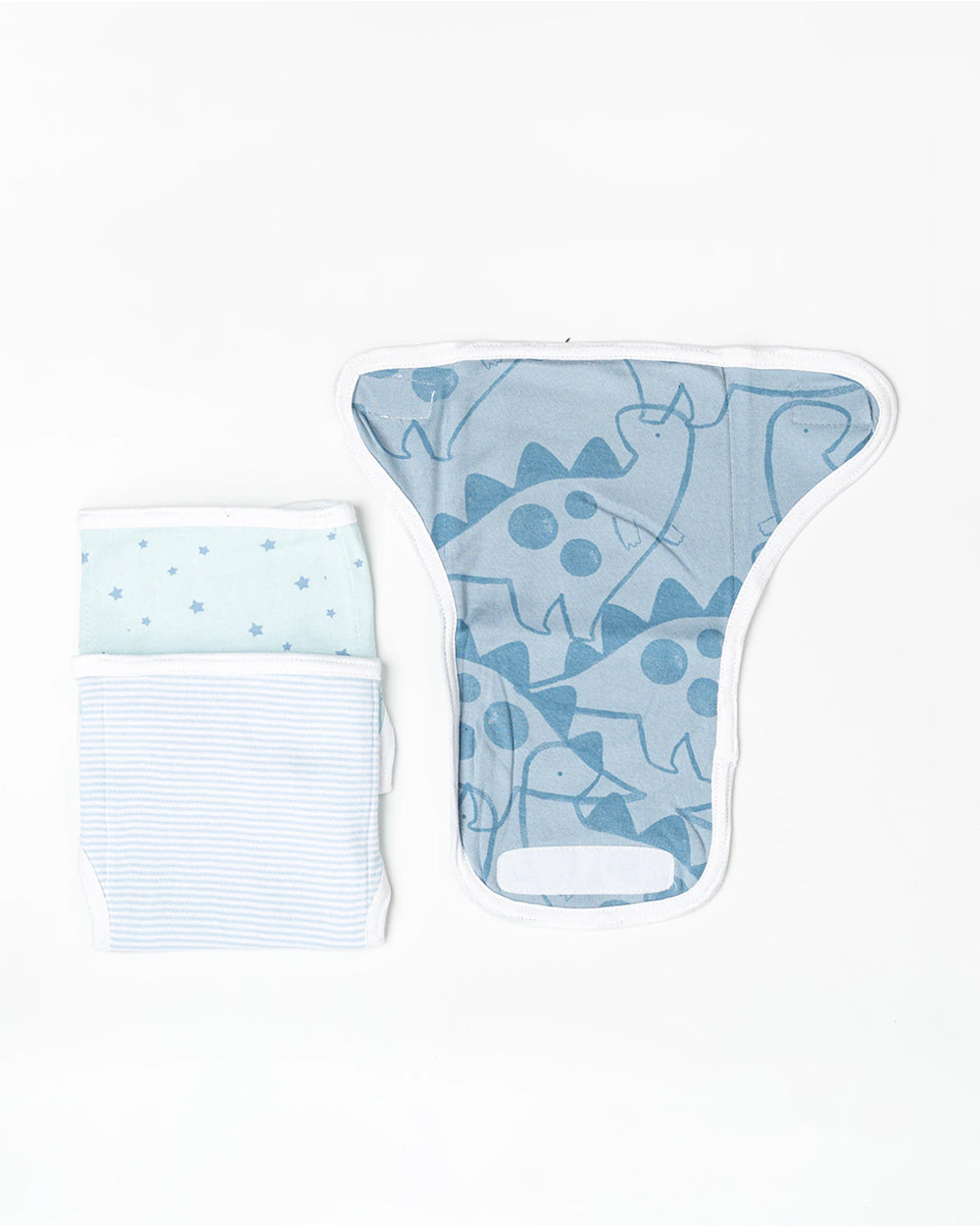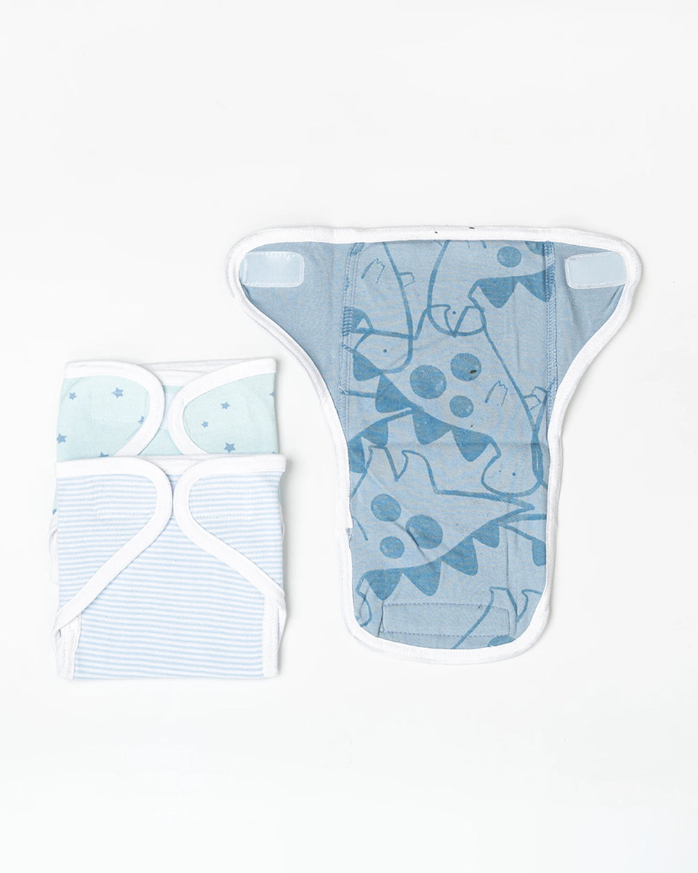 BeeLittle Blue Dino Velcro Nappy-Organic Cotton-Washable & Reusable-0 to 3M-Pack of 3