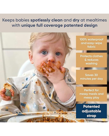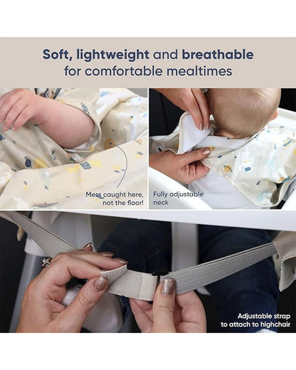 • Convenient, Adjustable Sleeve Bib:  Our adjustable toddler bib fits any highchair perfectly, with or without trays. Simply attach your versatile high chair bib to prams and tables to keep your child neat, clean, and dry when eating.