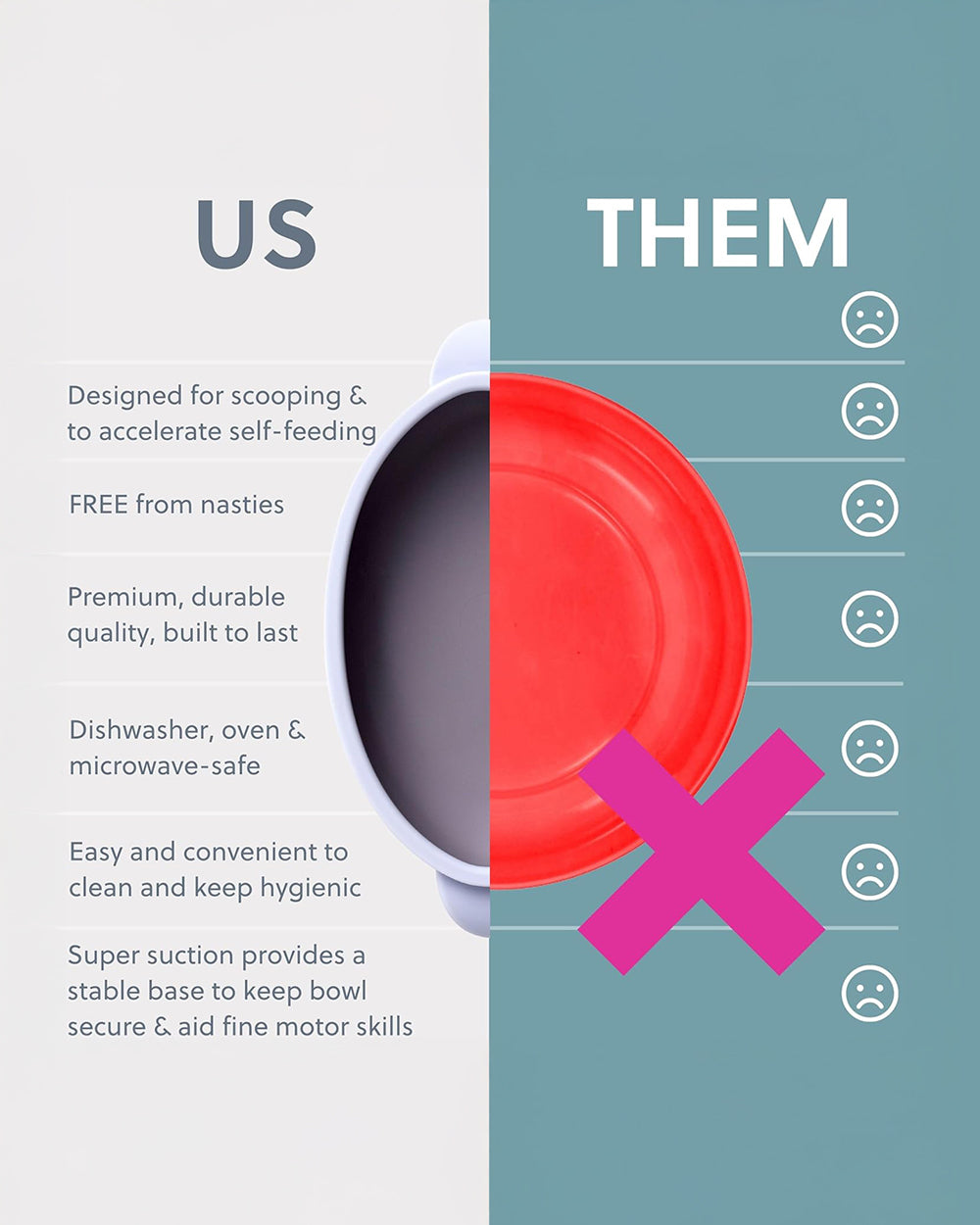 • Strong Suction Base: Keeps the bowl securely in place to prevent tipping and improve utensil control.