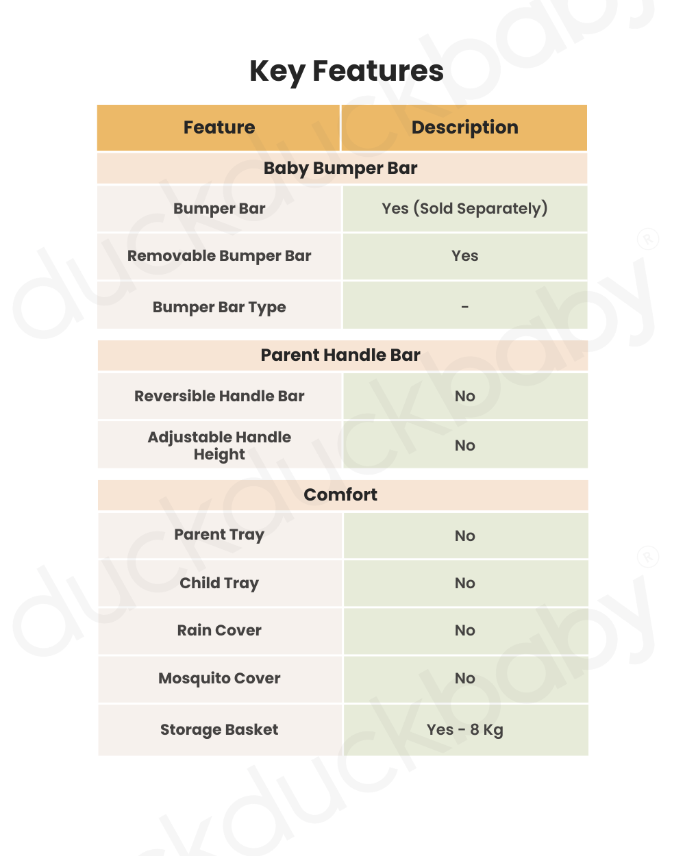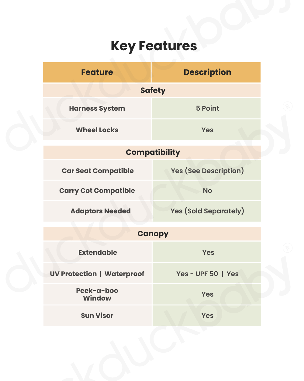 • Extendable Sun Canopy: UPF 50+ canopy with peek-a-boo panel for shade and ventilation.