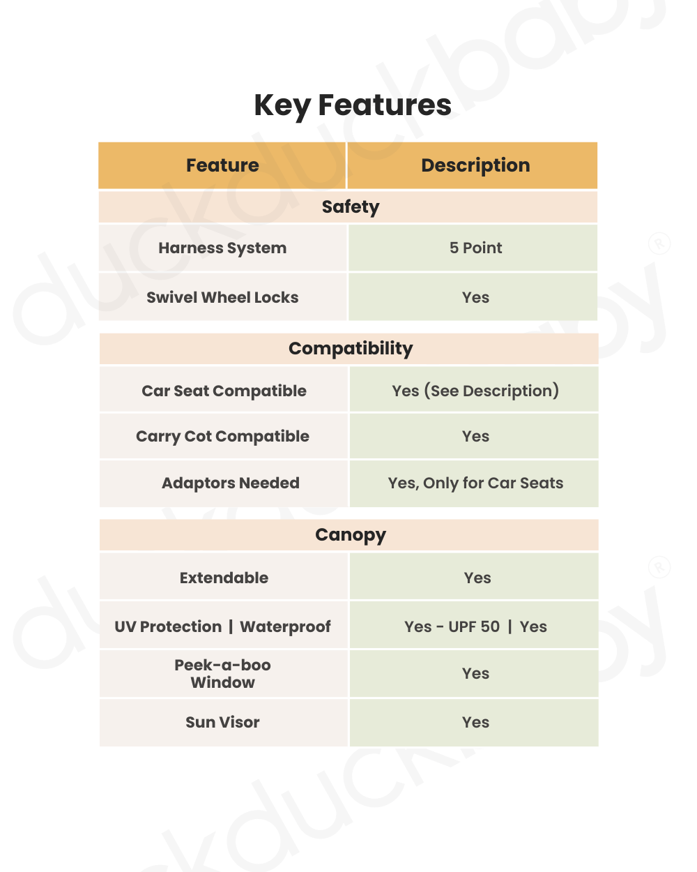 • Car Seat Compatibility: Compatible with select infant car seats using adapters (sold separately), allowing secure and convenient travel system use from day one.