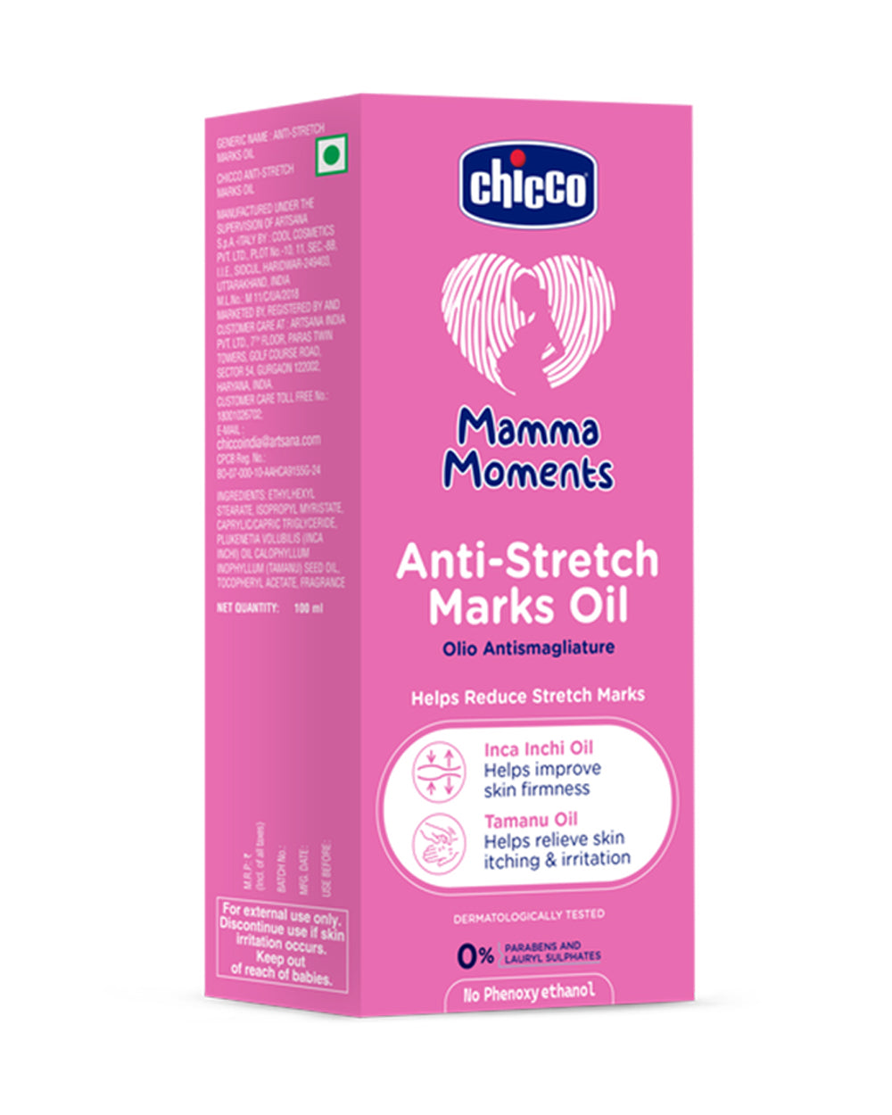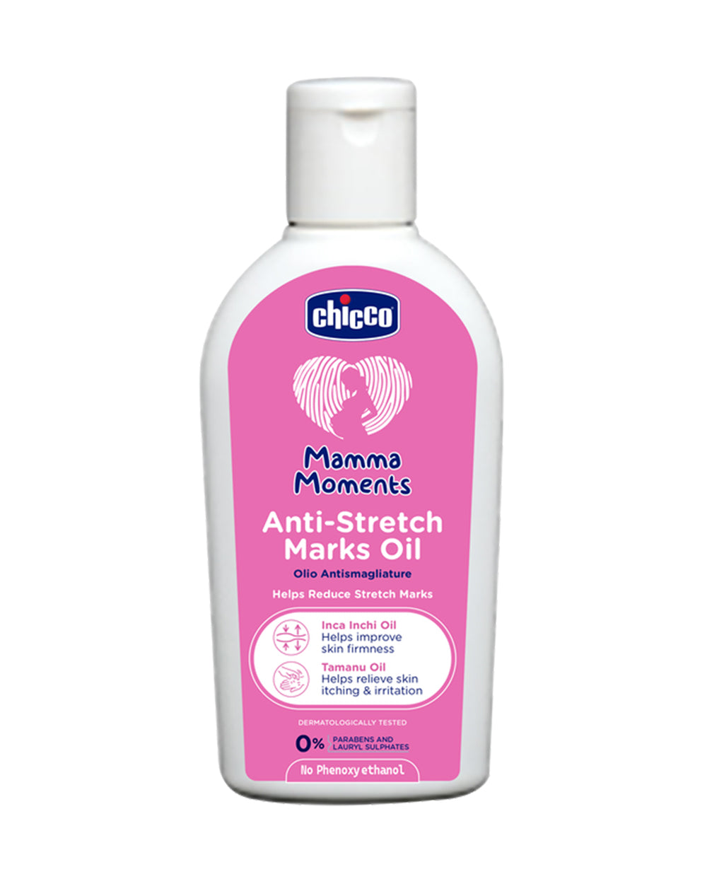 Chicco Mamma Moments Anti-Stretch Marks Oil 100ml is a nourishing skincare oil designed to support skin elasticity and reduce the appearance of stretch marks during pregnancy. Enriched with natural ingredients like Inca-Inchi oil and Tamanu oil, this dermatologically tested formula deeply hydrates, improves skin firmness, and relieves dryness and itching. Ideal for daily use, it is free from harsh chemicals such as parabens, alcohol, phenoxyethanol, and phthalates. With regular application, the lightweight, fast-absorbing oil keeps the skin soft, supple, and protected throughout the maternity journey.