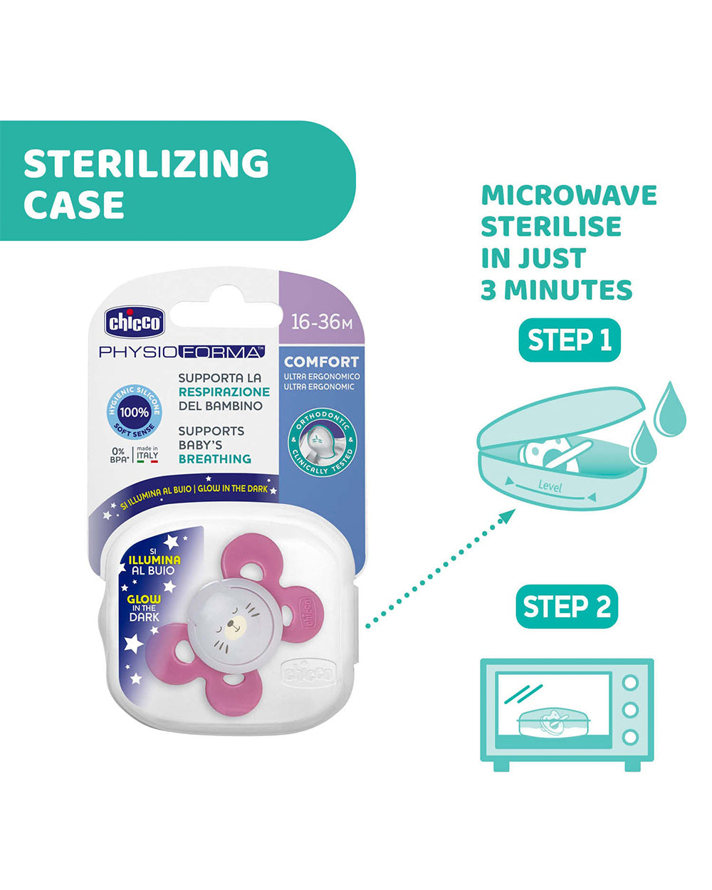 Chicco PhysioForma Comfort Soother-With Sterilizing Case-Orthodontic-Pink Lumi-16 to 36M-Pacifier