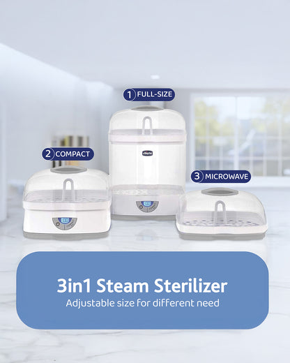 The Chicco 3-in-1 Sterilizer combines versatility and convenience with three smart configurations—Full Size, Compact, and Microwave. It uses 100% natural steam to eliminate 99.9% of germs in just 5 minutes, ensuring safe and chemical-free sterilization. The Compact mode saves up to 30% energy and is ideal for smaller loads, while the Microwave mode is perfect for quick, on-the-go sterilizing. An auto shut-off feature enhances safety and usability. Items stay sterile for up to 24 hours if unopened, reducing the need for frequent cycles. Its modular design adjusts to your lifestyle and space. Designed for modern parenting needs, both at home and while traveling.