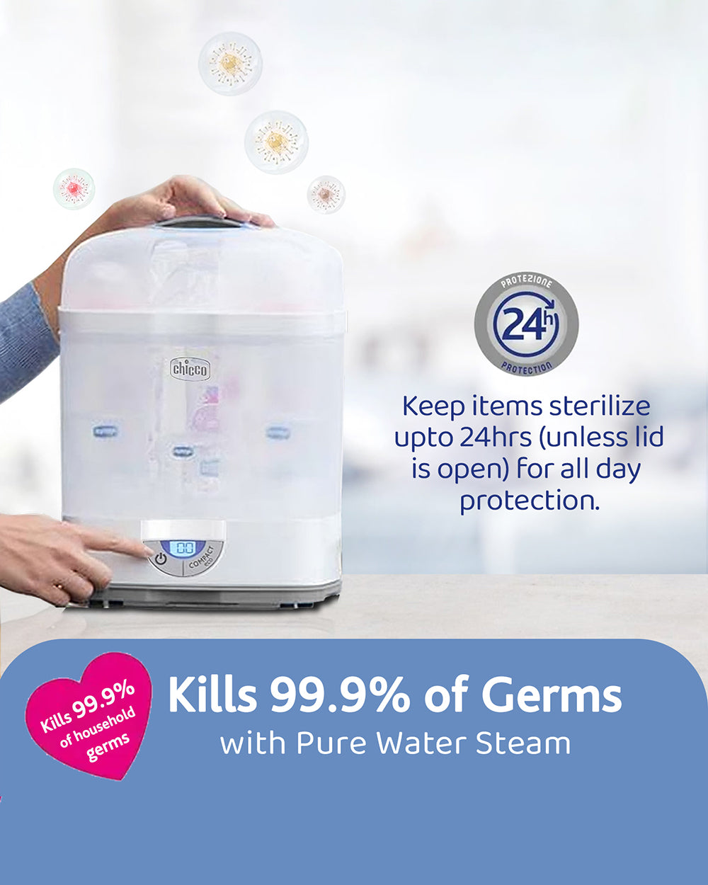 • 24-Hour Protection: The Sterilizer from Chicco keeps the objects or bottles sterilized for a duration of complete 24 hours till the time lid is closed.