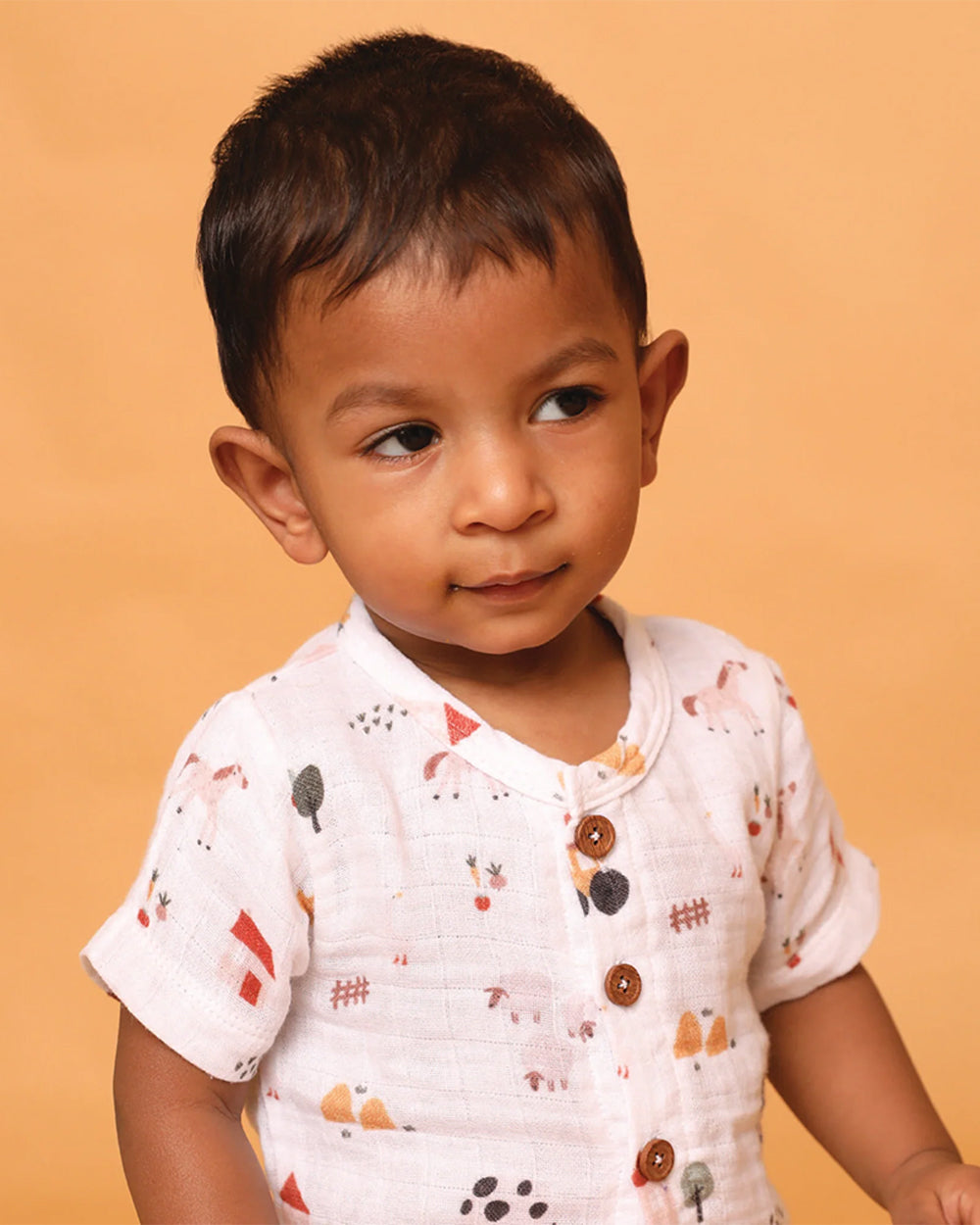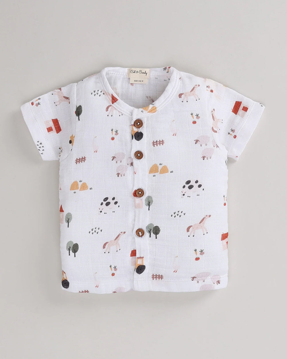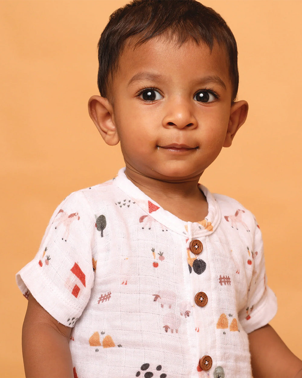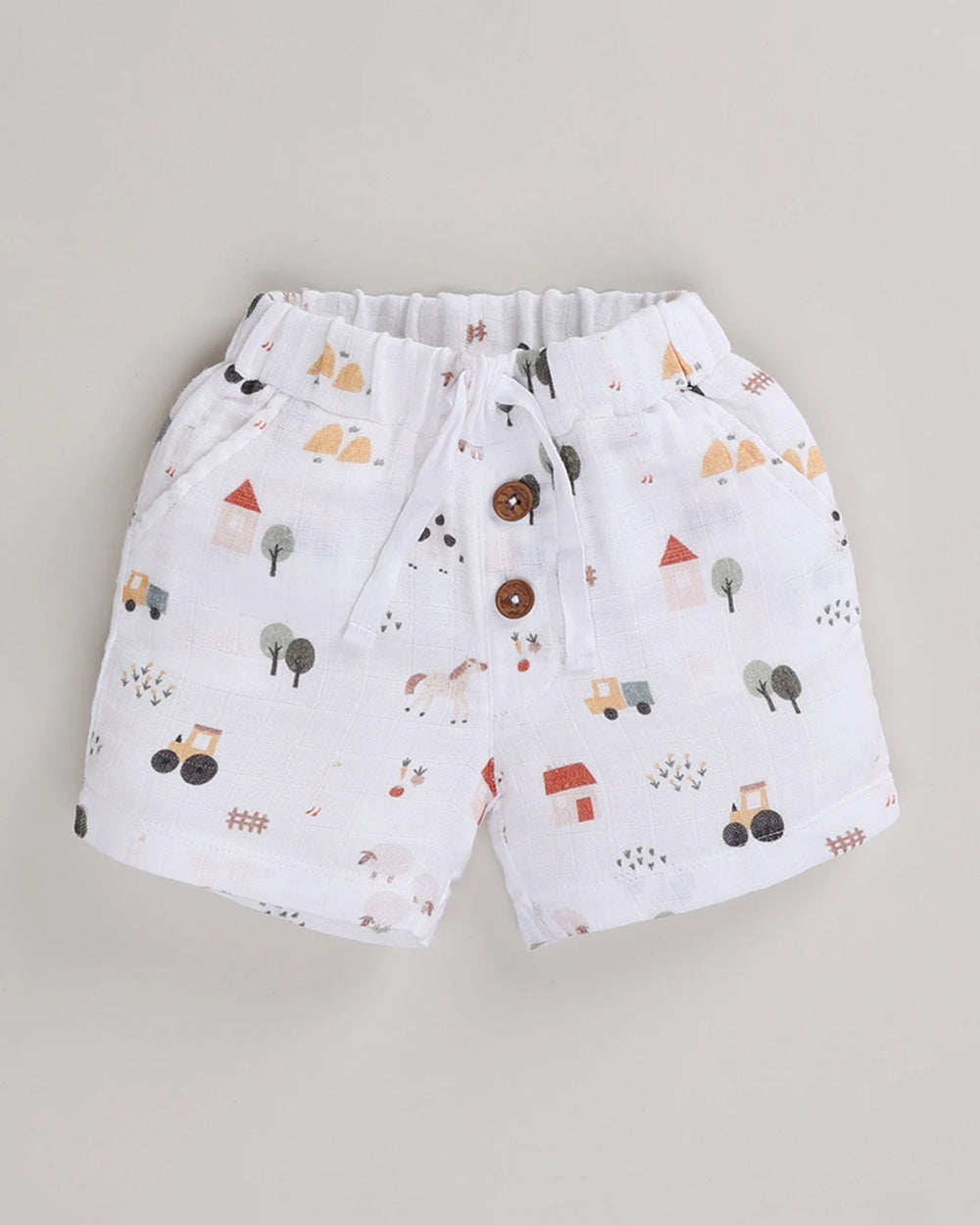 Cot & Candy Off White Top & Shorts Set-Organic Muslin-Farm Animals-For Infants