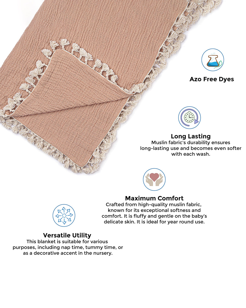 • Functional & Adorable: Ideal for stroller walks, tummy time, or snuggles in the nursery, this blanket adds charm while keeping your baby cozy. The tassel edges are not only stylish but also soothing for teething babies.