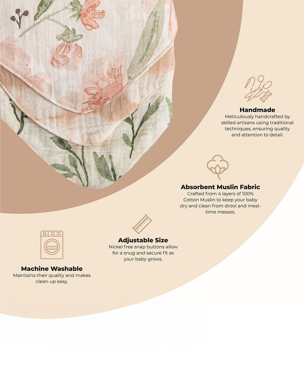 • Adjustable Fit: Featuring two snap buttons, our bibs provide a customizable fit, ensuring comfort and flexibility as your baby grows.