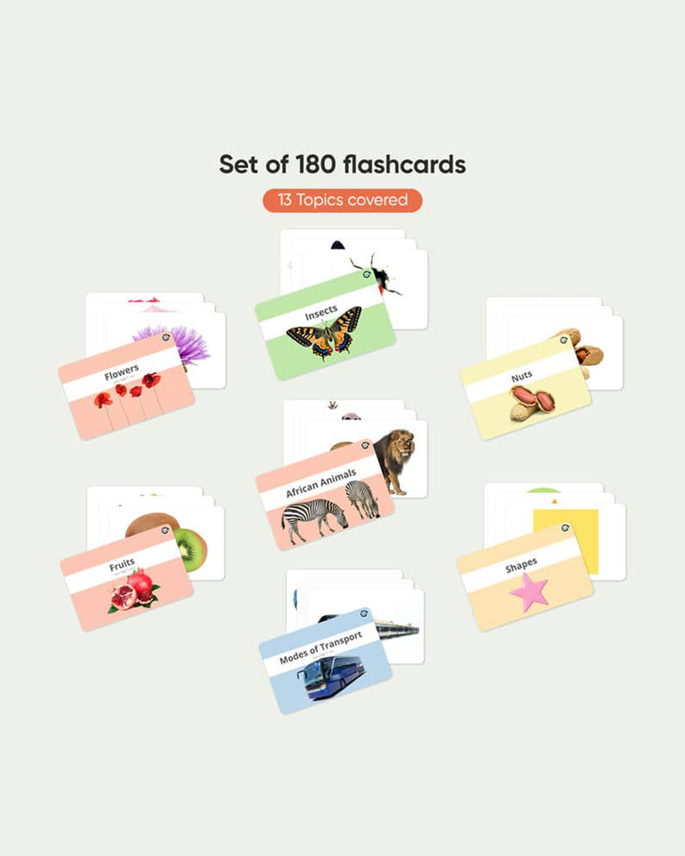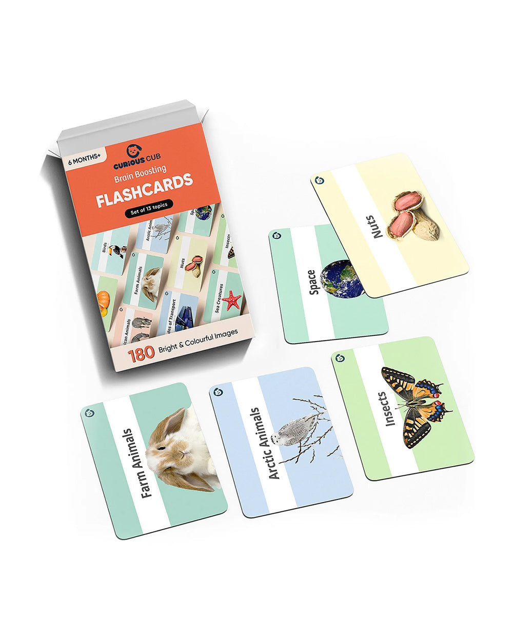 The Curious Cub Flash Cards set is a vibrant and interactive learning tool designed to stimulate young minds. With 180 high-contrast cards featuring animals, insects, fruits, vegetables, and more, it introduces babies to a world of colors, vocabulary, and early concepts in a fun and engaging way.