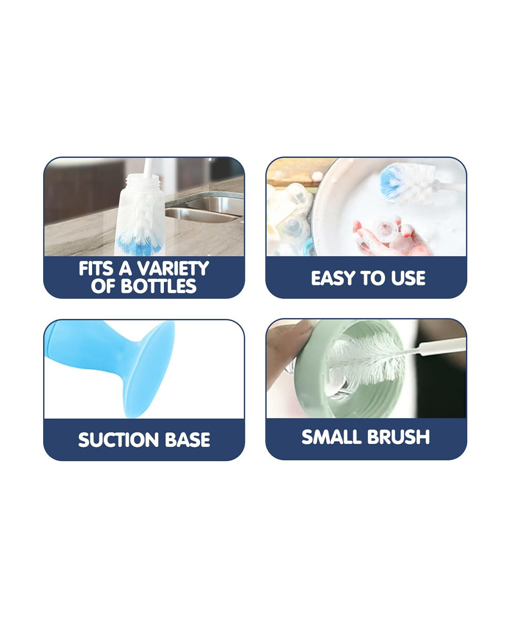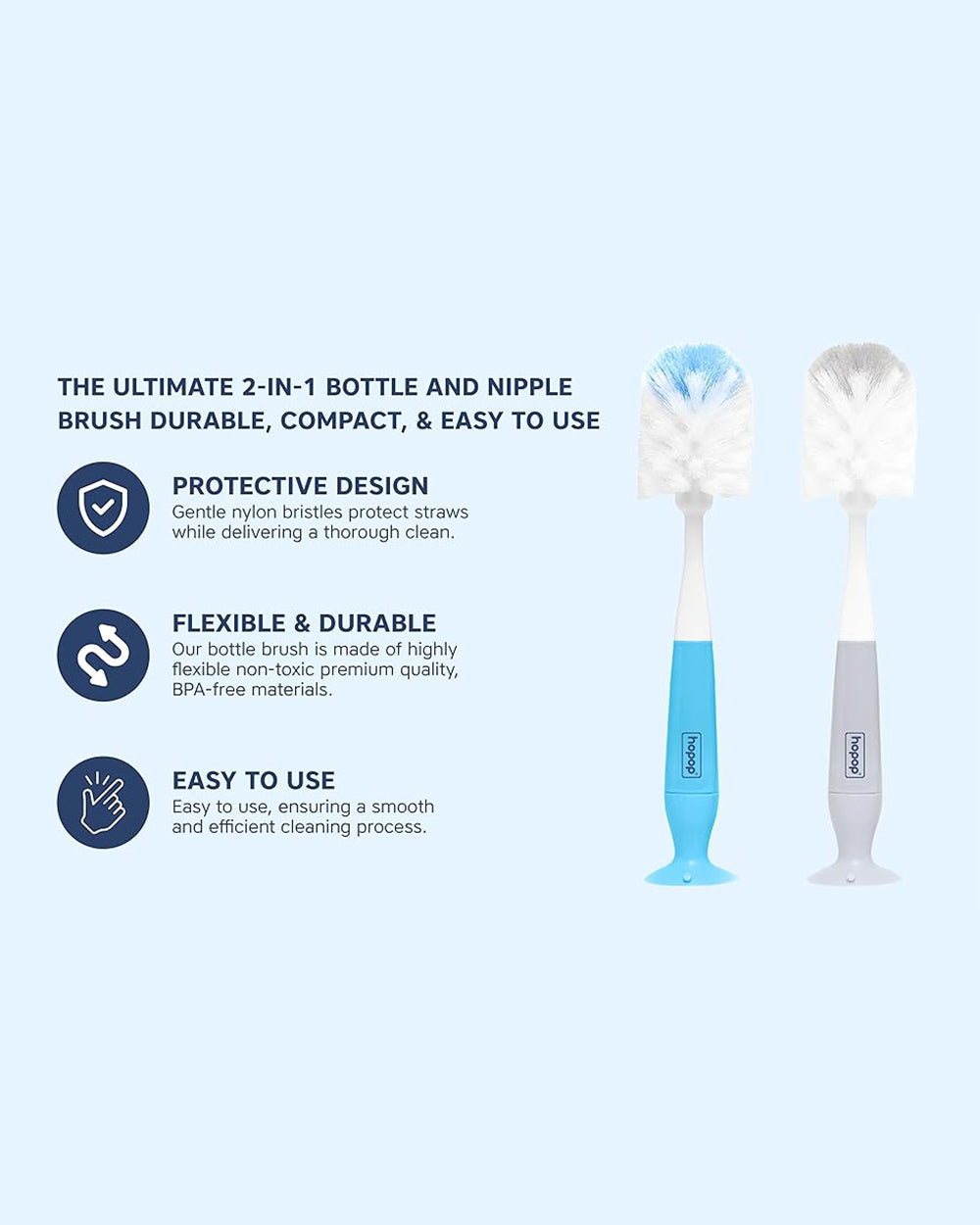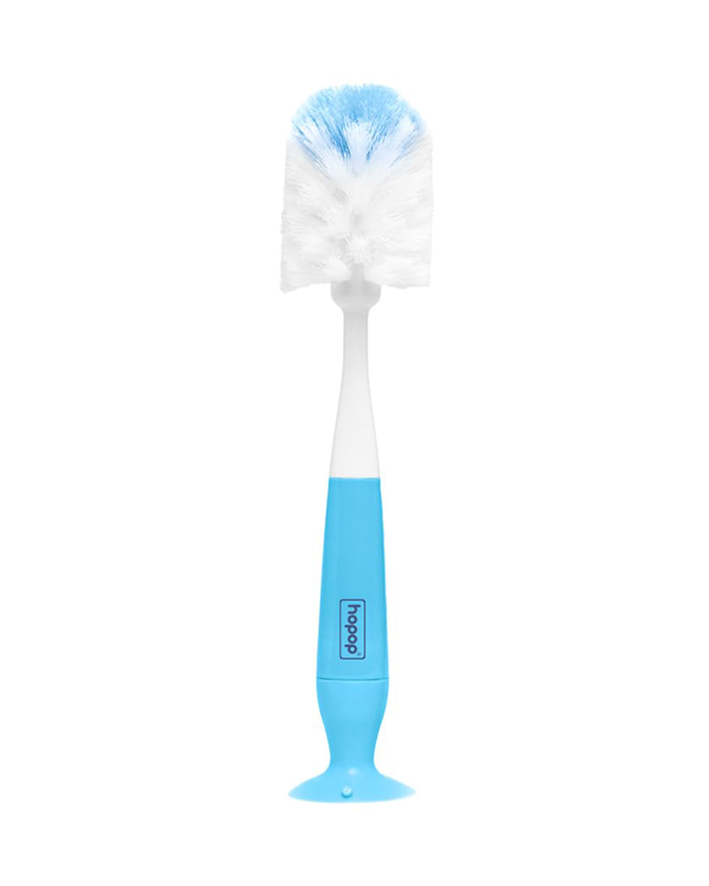 Hopop 2 in 1 Bottle & Nipple Cleaning Brush Set-Grooved Handle With Suction Base-Flexible Bristles-Comfortable Grip-Blue