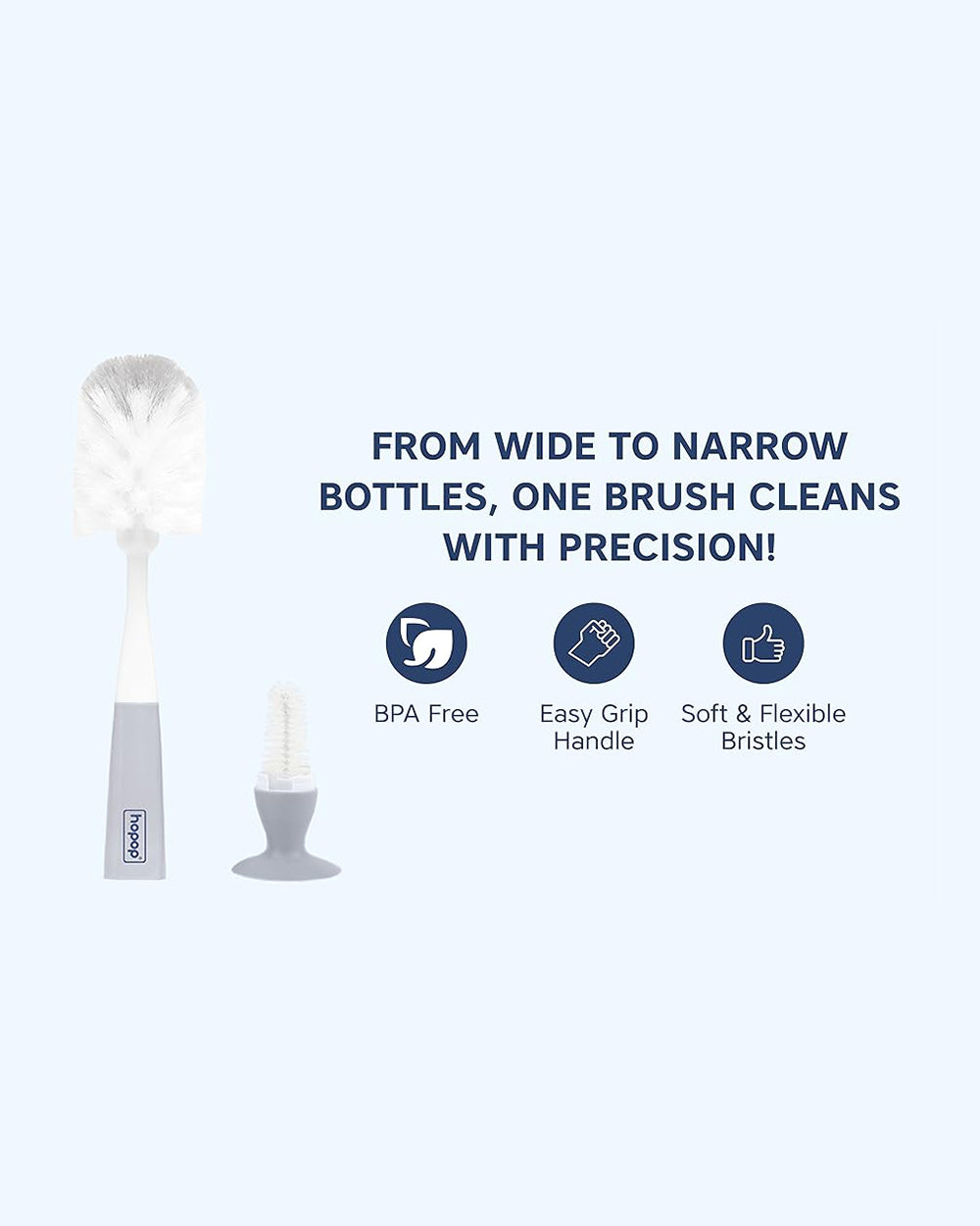 The Hopop 2‑in‑1 Bottle & Nipple Cleaning Brush is an essential tool for parents who prioritize hygiene and convenience in baby care. Crafted from non-toxic, BPA‑free materials, it features high-quality, flexible bristles attached to a sturdy stainless‑steel core, offering durability and thorough cleansing. Engineered to reach every corner of both narrow and wide-neck bottles, it efficiently removes milk residue and harmful bacteria, while rotating bristle action ensures a deep clean. The ergonomic grooved handle provides a secure, comfortable grip during use, and the integrated suction base keeps it upright and within easy reach, helping maintain kitchen cleanliness.