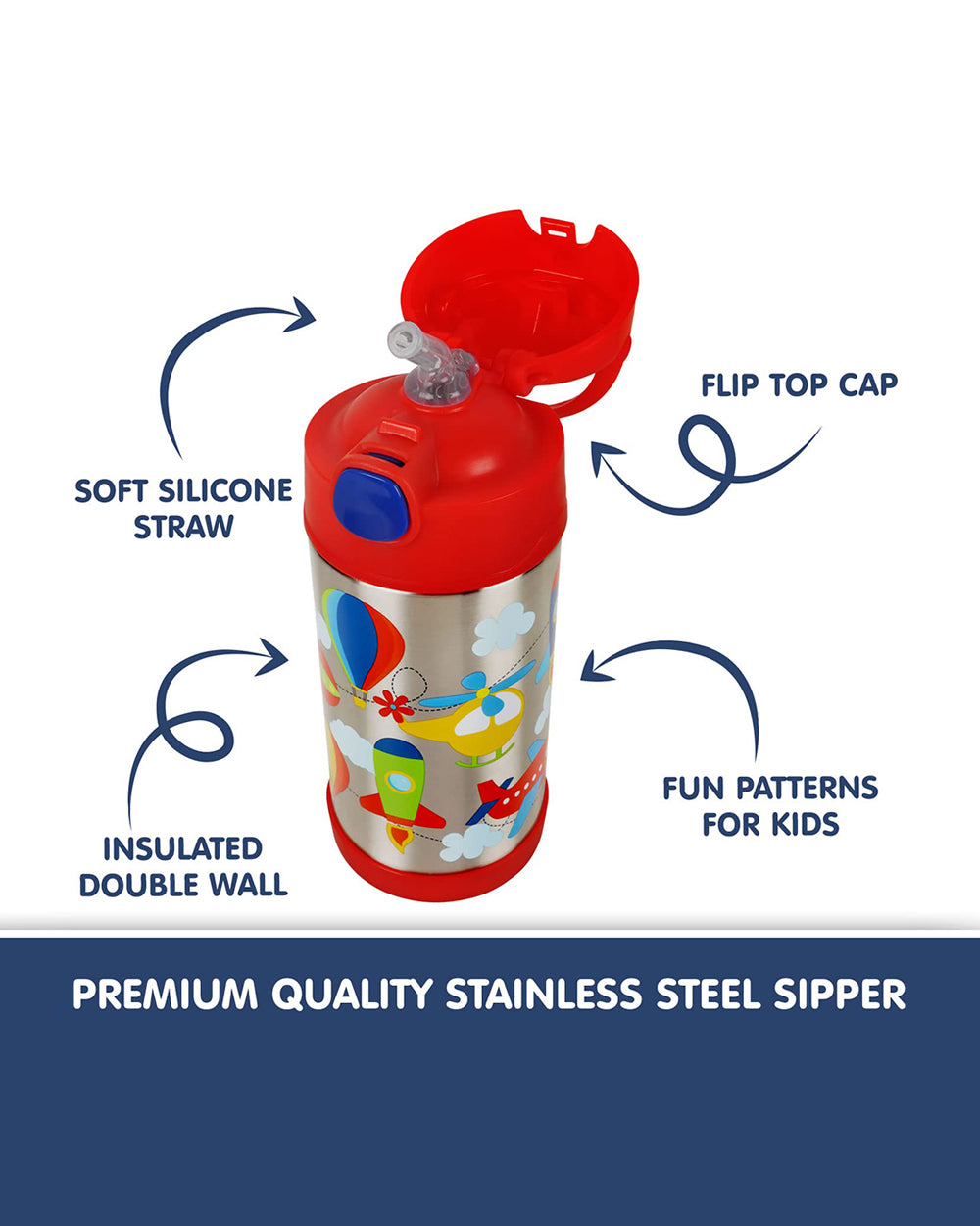 Hopop Insulated Stainless Steel Sipper Water Bottle for Kids-Flyhigh Design-300ml
