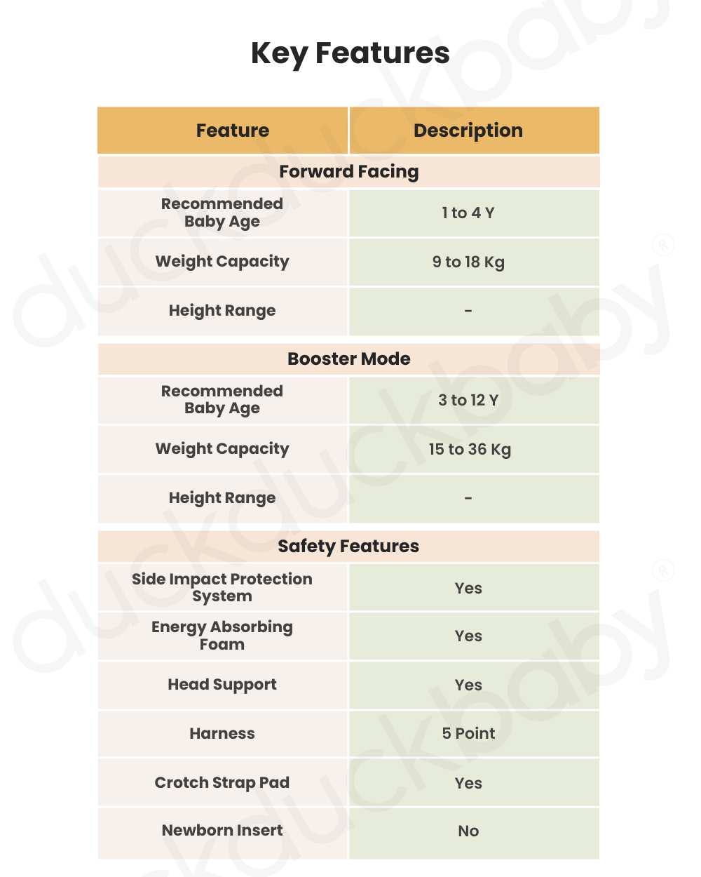 • 5-Point Harness: Provides maximum safety for children weighing 9-18 kg, transitioning smoothly to a belted booster as your child grows.