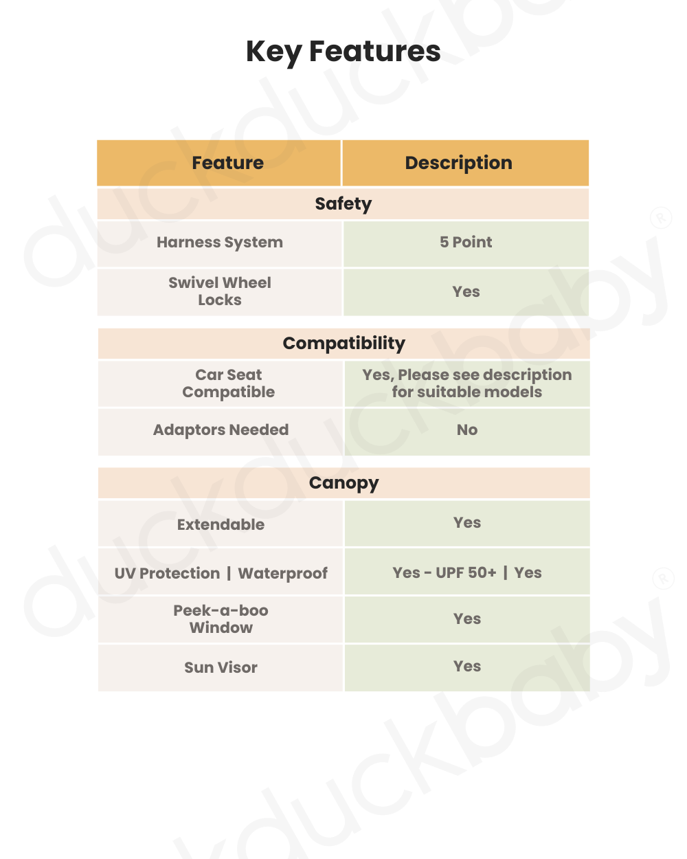 • Lie-Flat Recline: Creates a cosy, ergonomic haven for newborn naps and restful rides through toddlerhood.