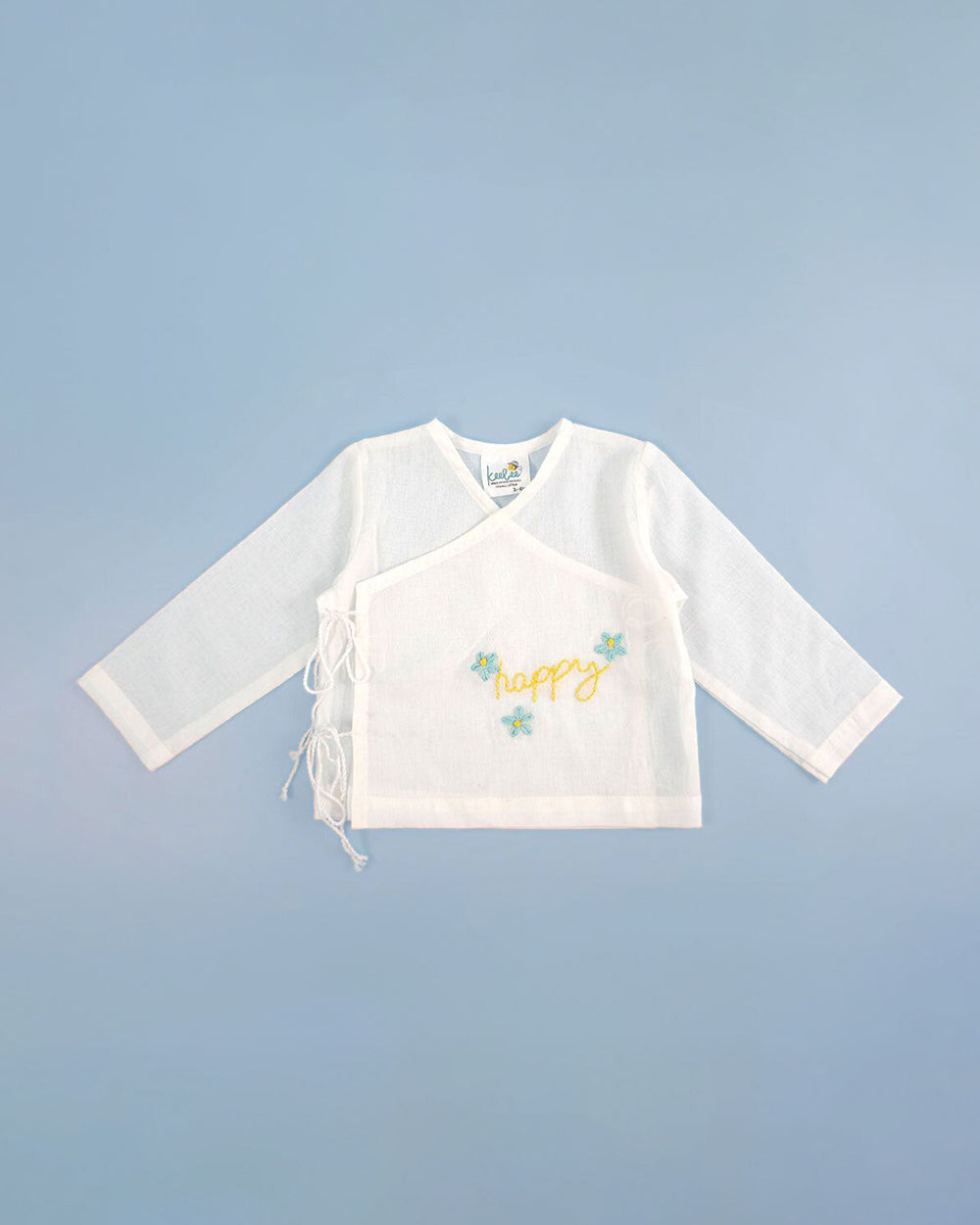 Keebee White Kimono Jhabla-Happy Embroidered-Organic Cotton-For Infants