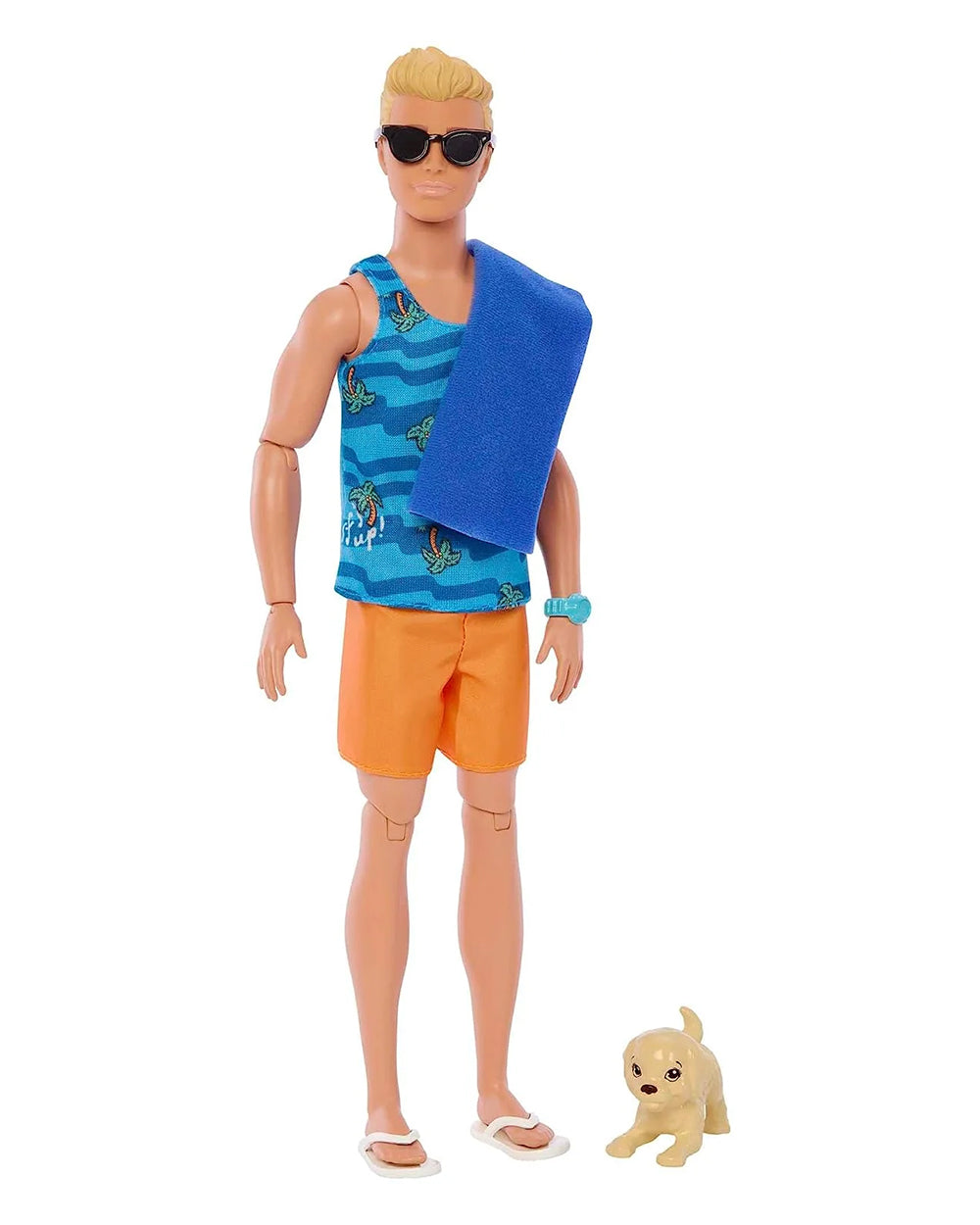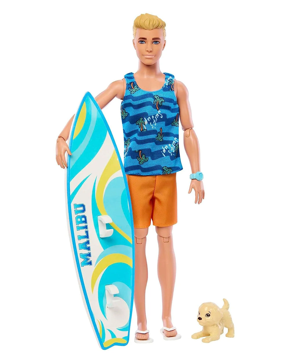 Ken Doll with Surfboard and Pet Puppy-Includes 1 Ken doll, 1 surfboard, 1 puppy figure, 1 towel and assorted accessories-Promotes Role Play-Doll & Doll Houses-36M+